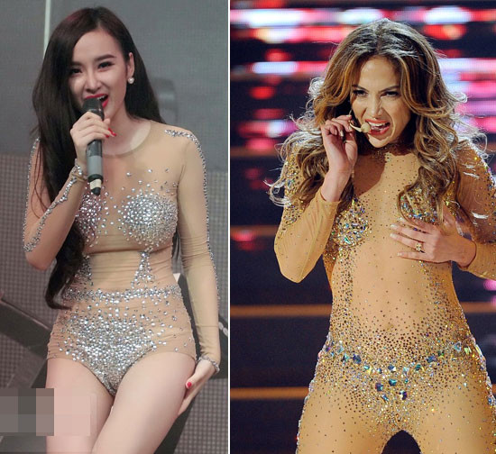 Bộ trang phục bỏng mắt mà Angela Phương Trinh từng diện trên sân khấu gần như copy toàn bộ ý tưởng với trang phục của Jenifer Lopez.