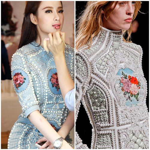 Có lẽ, Phương Trinh đang muốn hướng tới hình ảnh sang trọng, lộng lẫy và quý phái giống như ngôi sao nổi tiếng Hoa ngữ - Phạm Băng Băng. Ngoài việc copy phong cách thời trang, làm tóc và trang điểm giống y hệt bản gốc, ‘bà mẹ nhí’ thường xuyên diện những thiết kế na ná với mẫu váy mà nàng hoa đán nổi tiếng từng mặc.