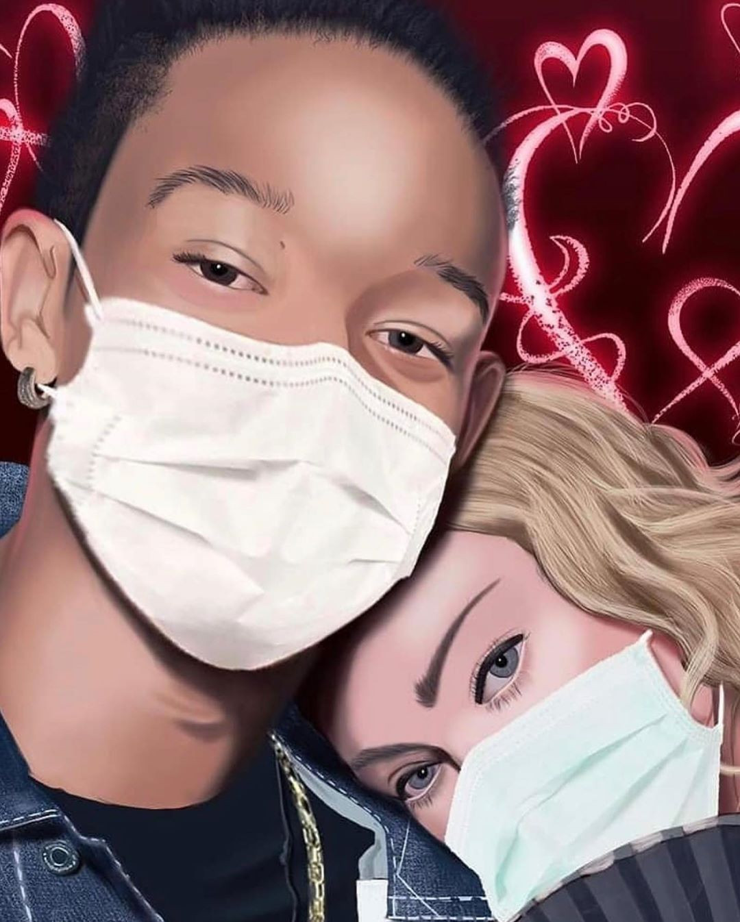 Madonna tựa đầu e ấp bên vai trai trẻ. Cả hai đeo khẩu trang kín mít phòng dịch bệnh COVID-19.