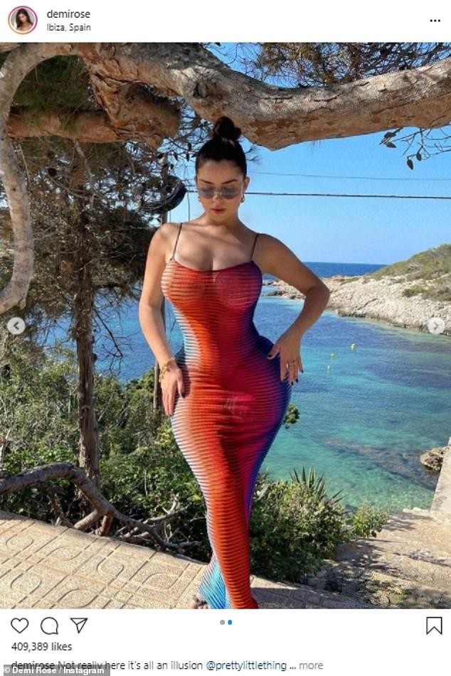 Nàng mẫu nội y đình đám xứ sương mù mới đây tung lên Instagram cá nhân bức ảnh mặc 2 dây váy bó sát, tông đỏ cam, xuyên thấu phô đường cong thể hình nóng "bỏng mắt". Demi Rose không quên quảng cáo đây là trang phục của PrettyLittleThing - thương hiệu mà cô hợp tác làm gương mặt đại diện cách đây chưa lâu.