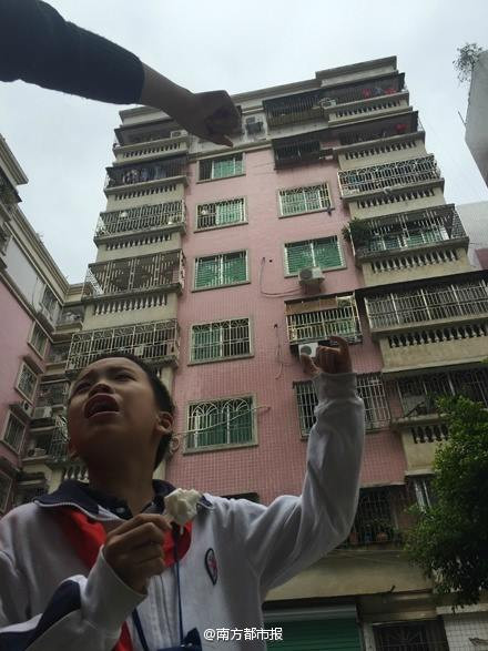 Khoảng 9 tối ngày 10/10, em bé trèo ra cửa sổ của căn hộ tầng 5 ở Huệ Châu, tỉnh Quảng Đông và bị mắc kẹt vào thanh chắn cửa. Lúc đó, em đang ở nhà 1 mình.