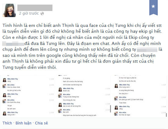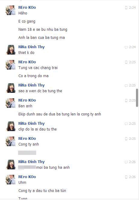 "Tình hình là em chỉ biết anh Thịnh là qua face của chị Tưng khi chị ấy viết status là tuyển diễn viên gì đó chứ không hề biết ảnh là của công ty hay ekip gì hết. Còn em nhận được 1 lời đề nghị cá nhân của một người nói là ê-kíp công ty *** đã đưa Bà Tưng lên. Đây là đọan em chat. Anh ấy có đề nghị mình chụp ảnh để đem lên công ty nhưng mình sợ không biết công ty *** là sao và mình tìm trên google cũng không thấy nên đã từ chối. Còn chuyện anh Thịnh là không phải xin đầu tư gì hết chỉ là đơn giản thấy status của chị Tưng tuyển diễn viên thôi", Bà Tưng "em" chia sẻ.