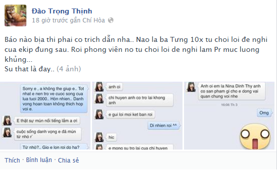Trước nội dung mà Đào Trọng Thịnh đưa ra, Bà Tưng 2.0 lập tức đăng lên trang Facebook của mình các tin nhắn mà chính người trong ê-kíp kia đã chủ động liên lạc với cô.