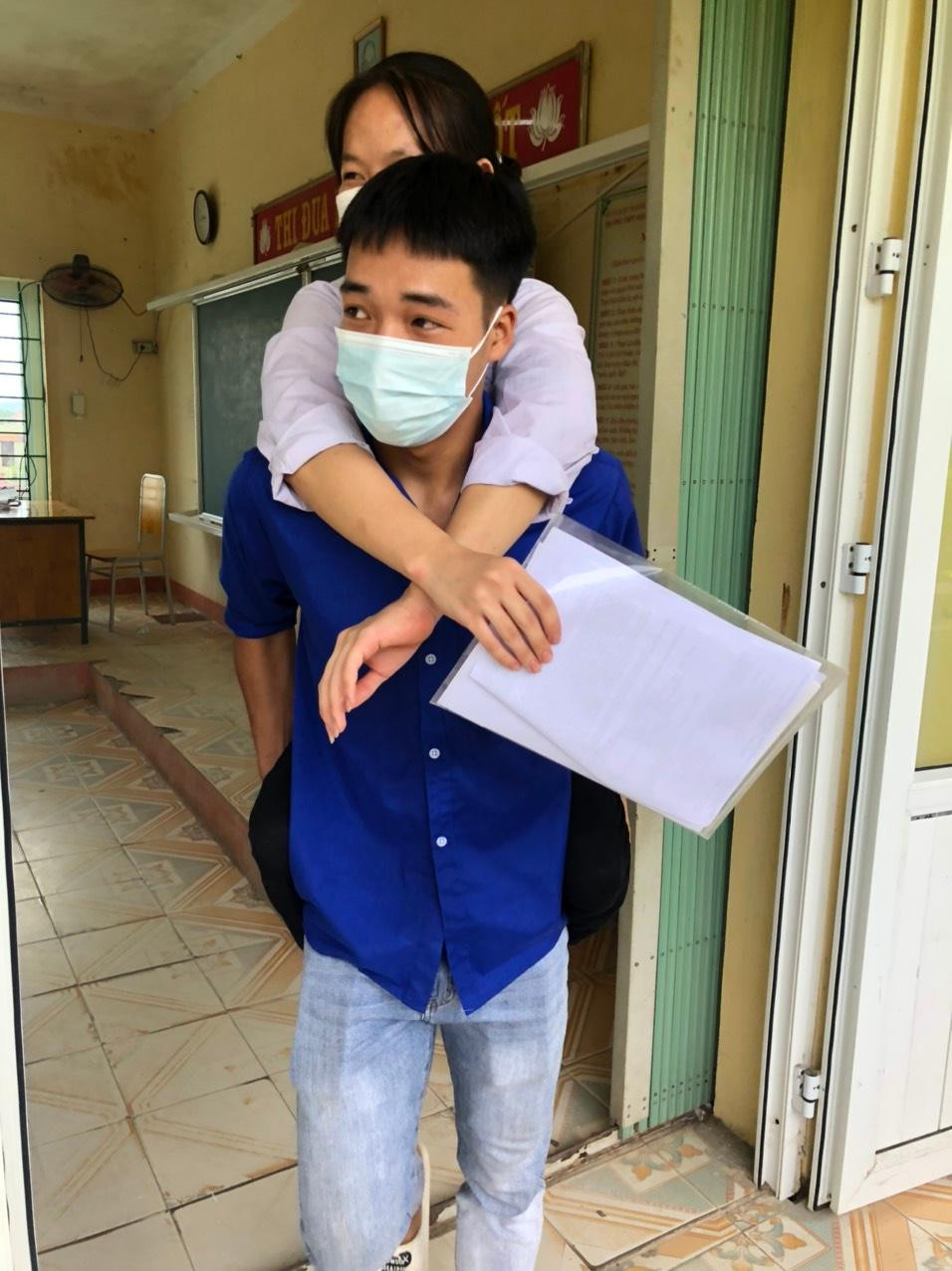 Ngày 7/7, khi tham gia những môn thi đầu tiên, Thuỳ được các anh chị thanh niên tình nguyện hỗ trợ cõng vào phòng thi để làm bài và cõng ra khi làm xong bài.