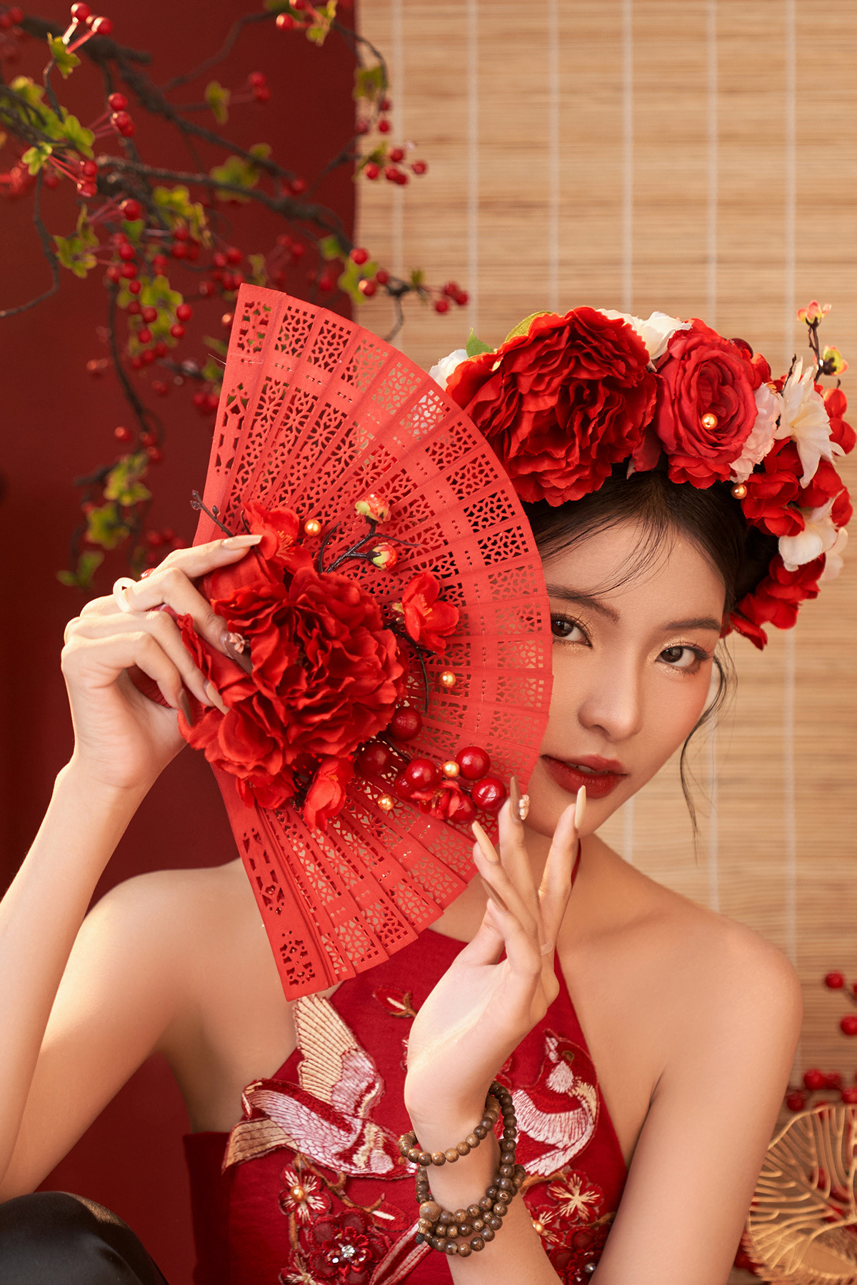 | Hình ảnh chiếc áo yếm đỏ, cùng mấn hoa được đính kết tỉ mỉ, ngụ ý cho vẻ đẹp quyến rũ, sắc sảo của người phụ nữ, cũng thể hiện sự may mắn, sung túc và đủ đầy. |