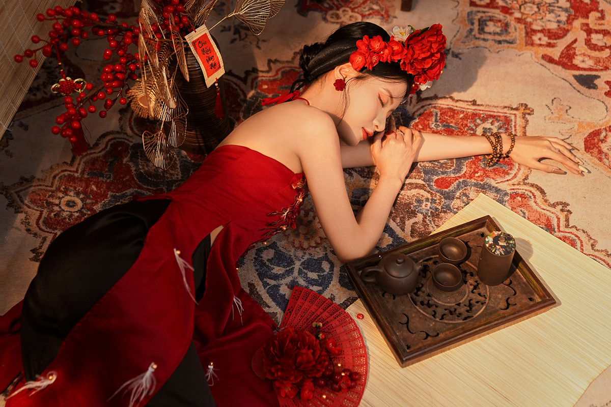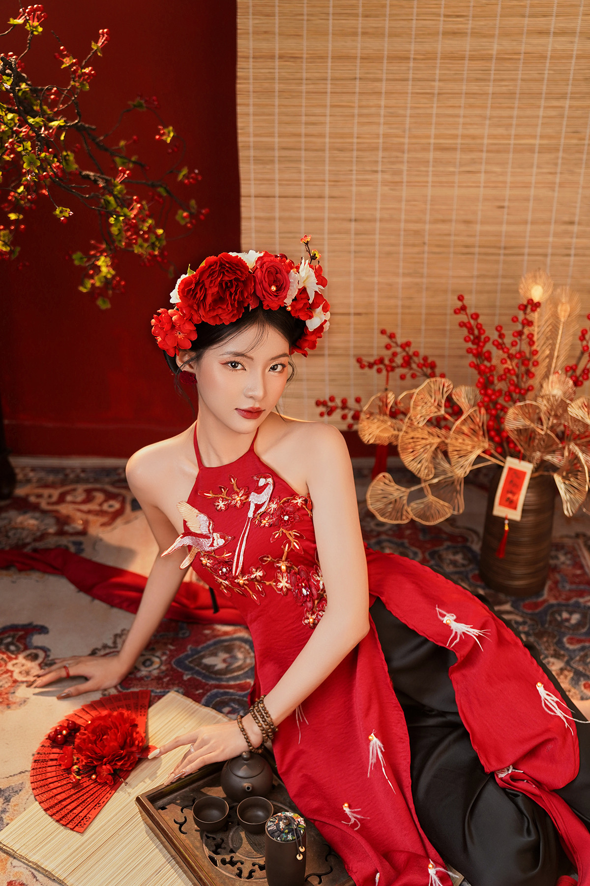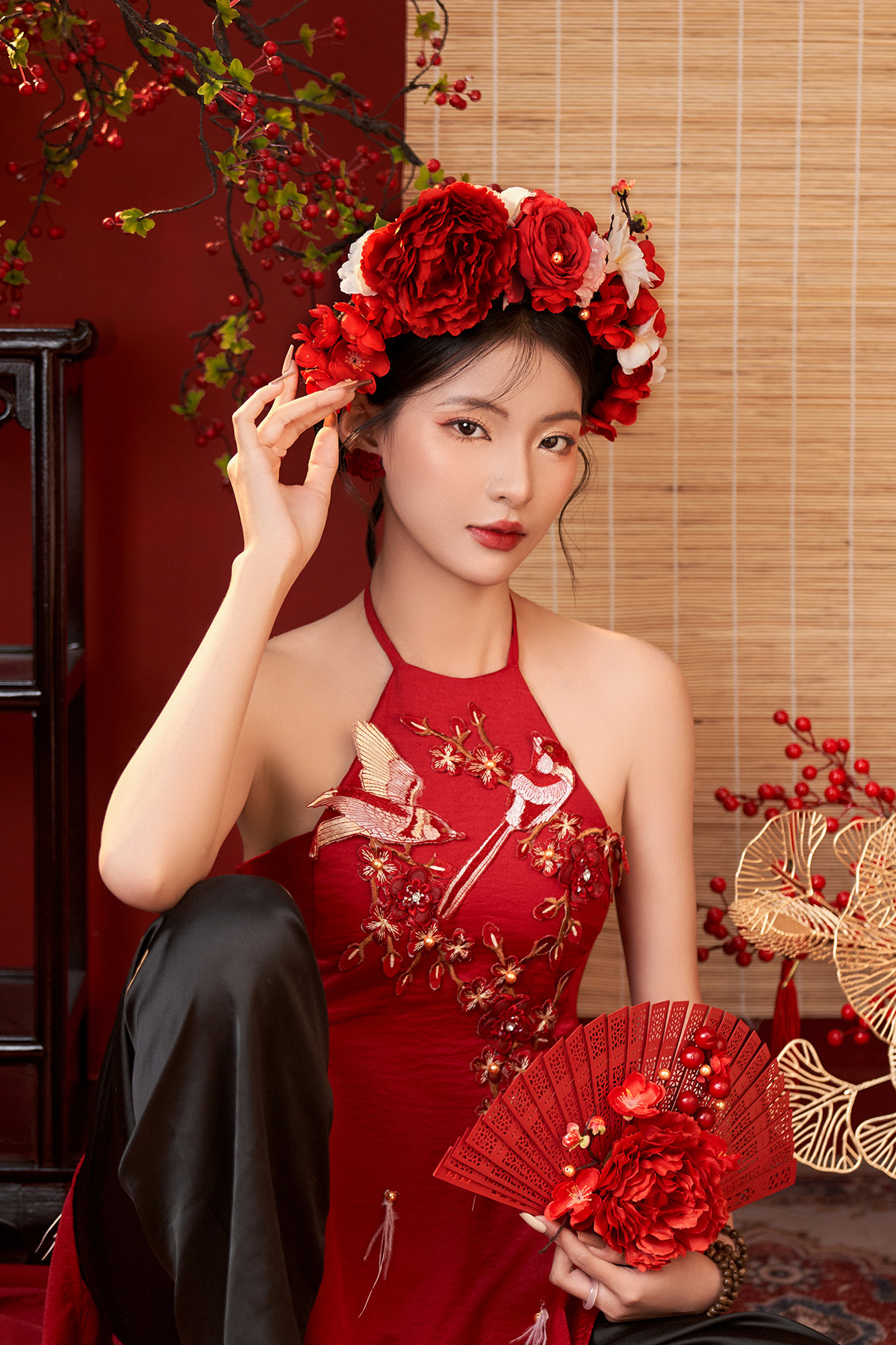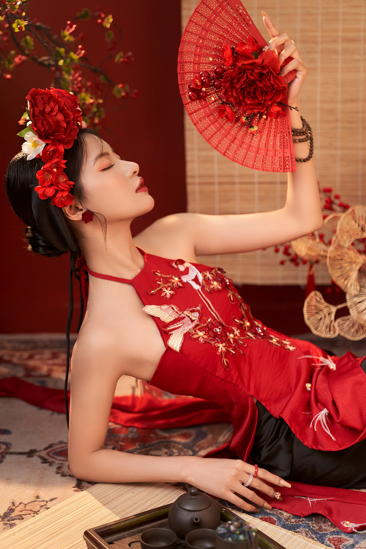 Trong truyện Kiều có câu: “Sẵn sàng, phượng liễn loan nghi. Hoa quan phấp phới hà y rỡ ràng”. Mang đến bộ ảnh với tên gọi “Hà Y” - có nghĩa là chiếc áo màu đỏ, rực rỡ như ráng trời. Hình ảnh chiếc áo yếm đỏ, cùng mấn hoa được đính kết tỉ mỉ, ngụ ý cho vẻ đẹp quyến rũ, sắc sảo của người phụ nữ, cũng thể hiện sự may mắn, sung túc và đủ đầy.
