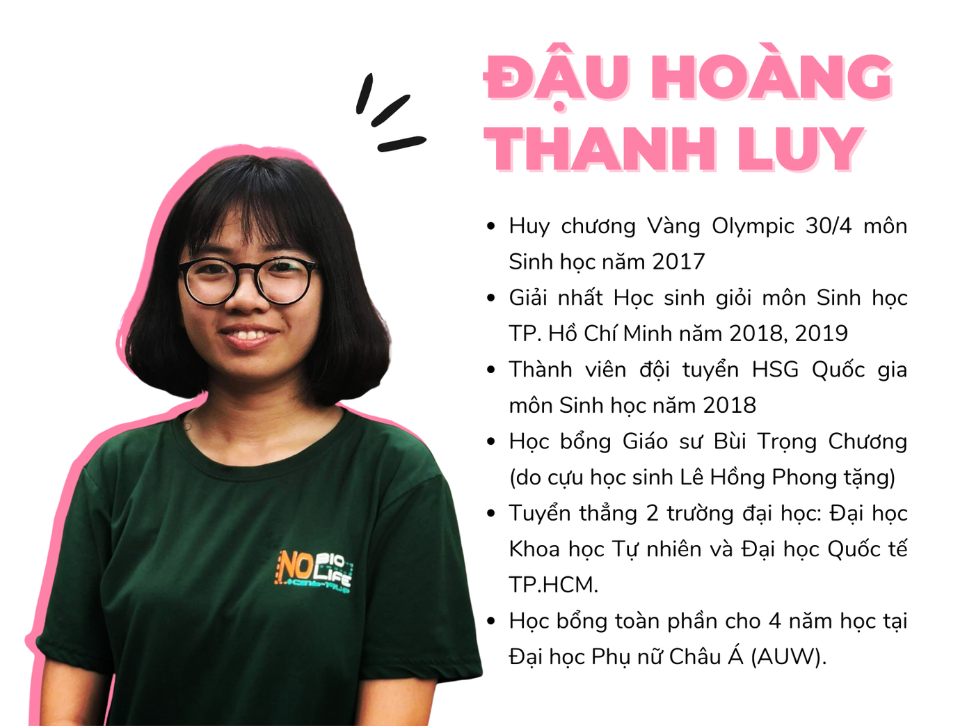 Đậu Hoàng Thanh Luy (20 tuổi) là cựu học sinh lớp chuyên Sinh, trường THPT Chuyên Lê Hồng Phong, TP. Hồ Chí Minh. Nhờ thành tích nổi bật tại các cuộc thi Olympic và Học sinh giỏi, cô được tuyển thẳng vào ngành Công nghệ Sinh học, Đại học Quốc gia TP. Hồ Chí Minh.