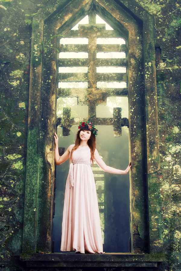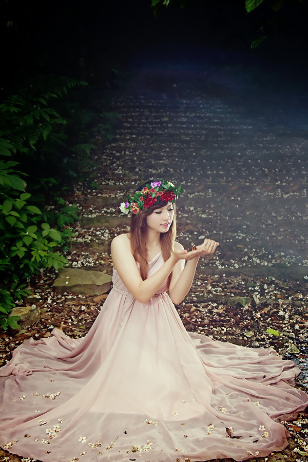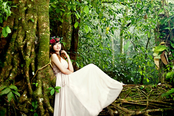Dưới vạt nắng rừng Quốc gia Ba Vì ảnh ảo như trong thế giới cổ tích, Bạch Trà My như lạc bước, phiêu du trong rừng với chiếc váy dài duyên dáng, vòng hoa kết trên đầu.