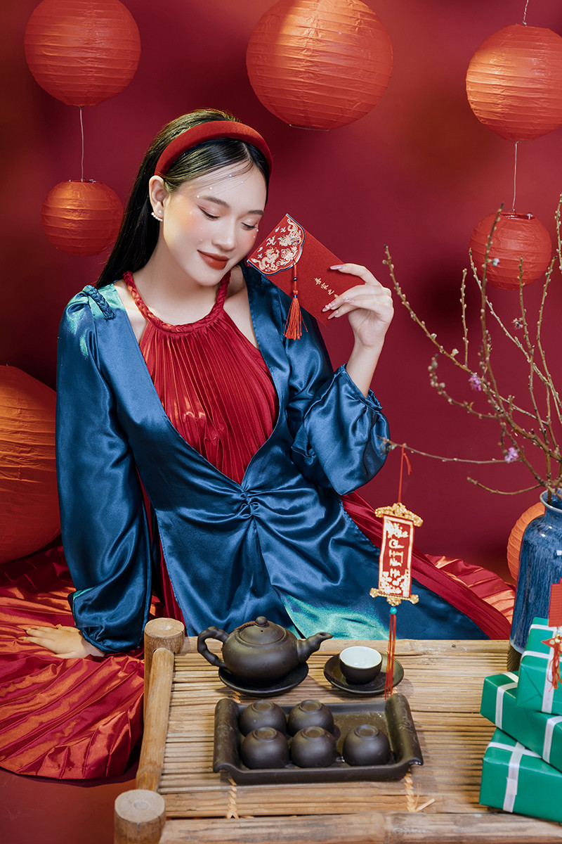 SVO - Lấy cảm hứng từ màu đỏ chủ đạo, tượng trưng cho sự may mắn, kết hợp với hoa đào mang âm hưởng ngày Tết Việt Nam, Quỳnh Trang mong rằng bộ ảnh sẽ mang đến một “Sắc Tết” rực rỡ, với sự tốt lành đến cho tất cả mọi người.