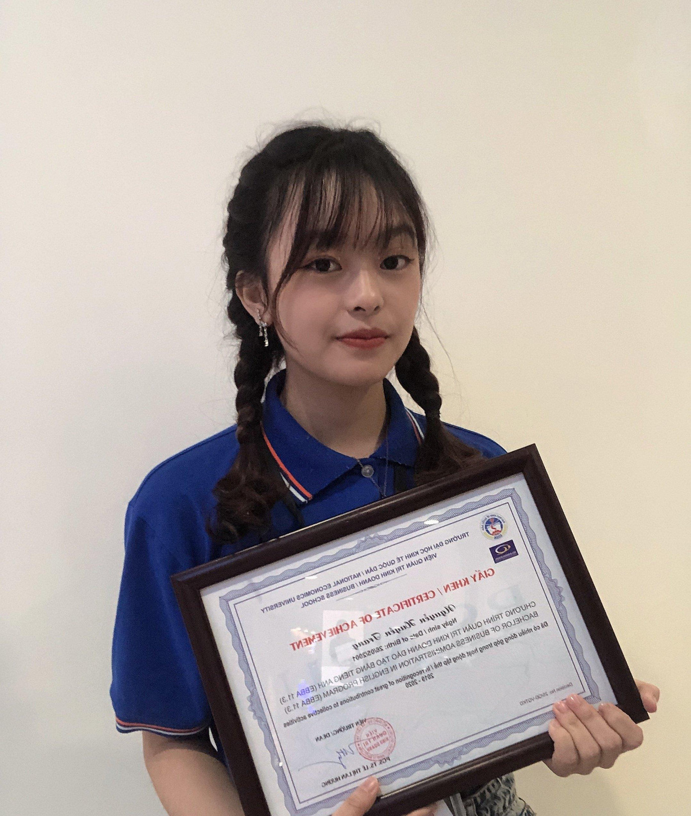 Hiện tại, GPA của mình đang ở mức 3.87/4.0 với 24 môn đạt điểm A, A+. Mình cũng nhận được học bổng khuyến khích học tập 2 năm liên tiếp từ Viện Quản trị Kinh doanh và vinh dự nhận được giải thưởng sinh viên tích cực tham gia các hoạt động khi còn là sinh viên năm nhất.