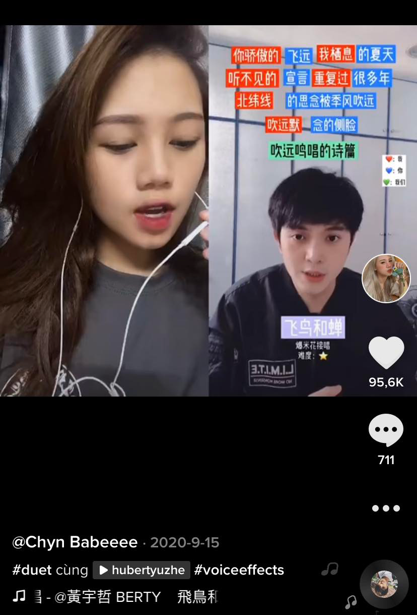 Năm 2020, mình biết đến ứng dụng TikTok. Mình được song ca với một anh ca sĩ người Trung Quốc 1 đoạn ca khúc “Phi điểu và ve sầu”, không ngờ sau một đêm mình nhận được 95,6K Tim và 1,3M người xem và rất nhiều người quan tâm để lại lời bình luận có khen, có chê, có người nói mình hát nhép. Mình luôn biết ơn họ, cảm ơn họ rất nhiều khi luôn đóng góp ý kiến trái chiều để mình tốt hơn, và đó là động lực để mình phát triển bản thân ngày càng hoàn thiện.