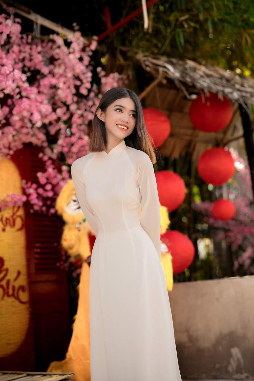 | Ngọc Duyên thanh thoát trong tà áo dài trắng tinh khôi. |
