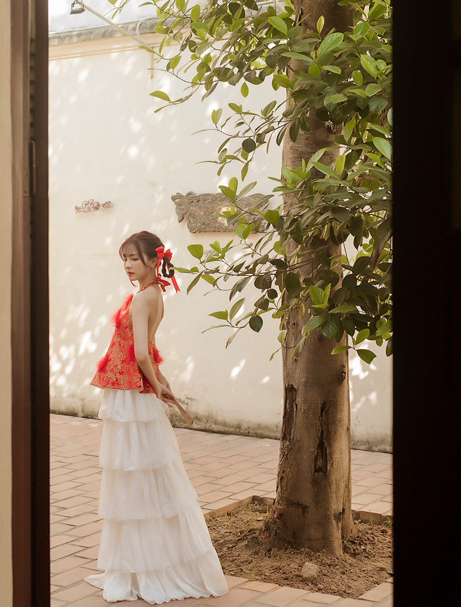 Thúy Hạnh chia sẻ: “Mình lựa chọn đây là nơi thực hiện bộ ảnh với khung cảnh nghệ thuật xưa, cùng với trang phục yếm đỏ pha chút hiện đại không quá phô trương. Nhẹ nhàng mà tinh nghịch. Qua đây, mình mong muốn gửi gắm một chút không khí của mùa xuân, mùa lễ hội, một chút bình yên của triển lãm, bình yên của một nơi nhỏ ở Hà Nội cổ kính đến tất cả mọi người, cho ta trở về một Hà Nội xưa”.