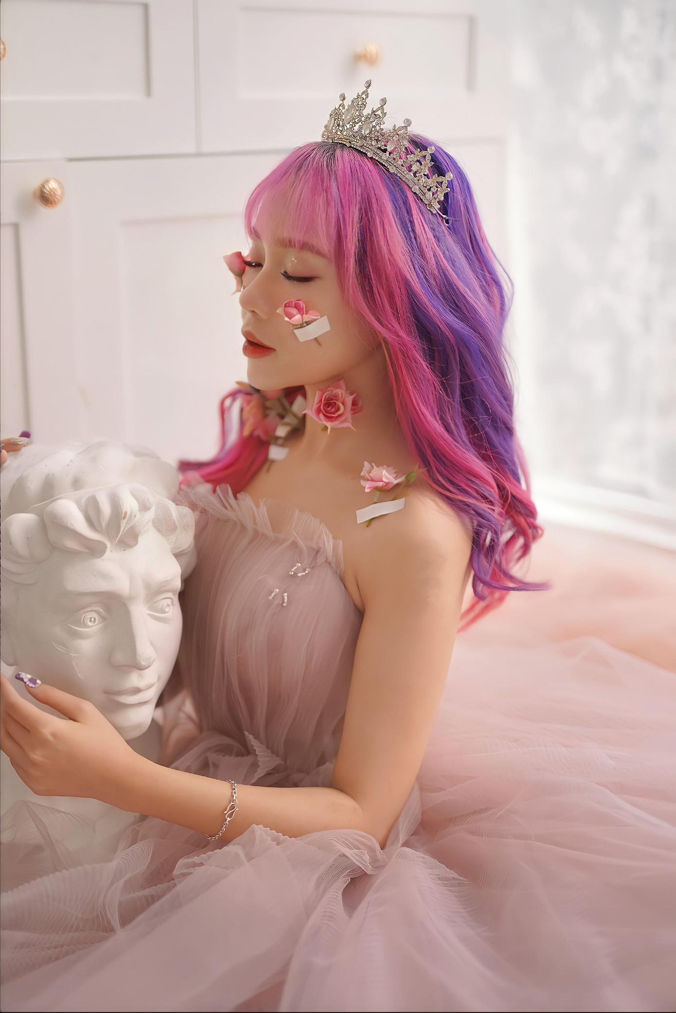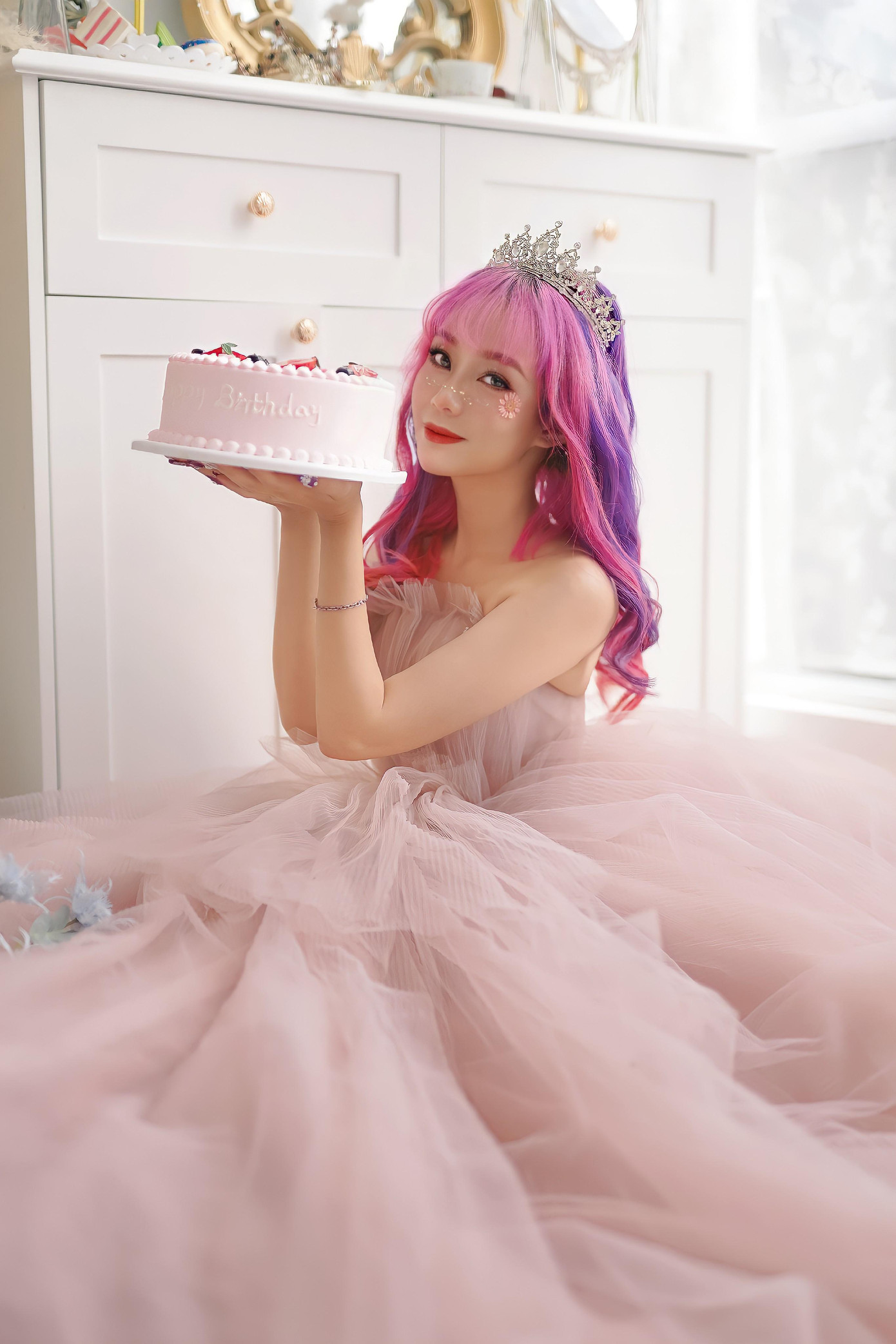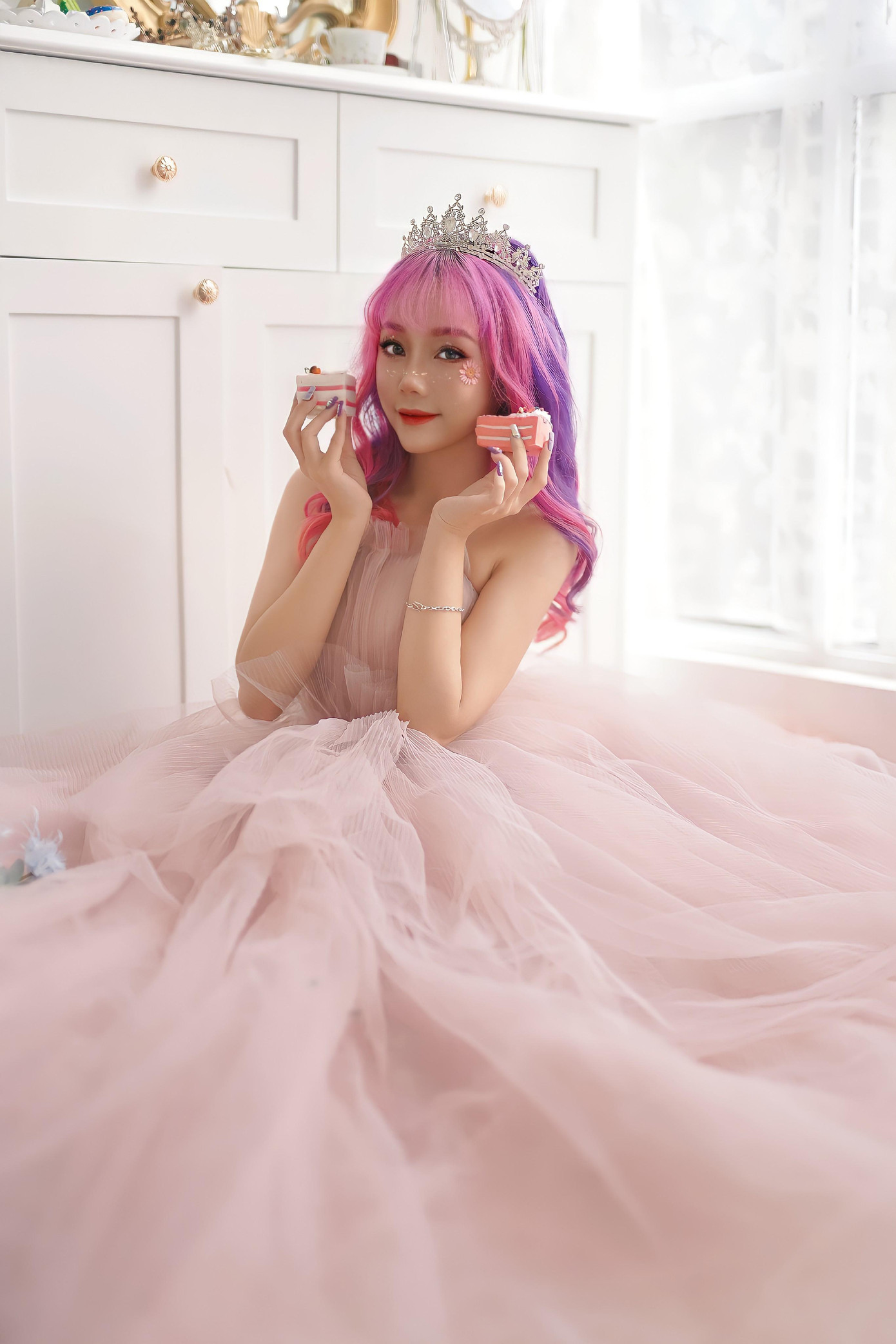Bộ ảnh được lên ý tưởng rất kĩ, từ makeup đến trang phục và bối cảnh sao cho phù hợp với tóc màu hồng của mình. Mình và anh Su đã mất khá nhiều công sức để lên kế hoạch và chuẩn bị nhiều phụ kiện cầu kì cho concept này. Điểm nhấn của bộ ảnh là chiếc váy công chúa bồng bềnh và chiếc bánh kem, mình kết hợp vương miện trắng làm dịu sắc hồng đi một chút.