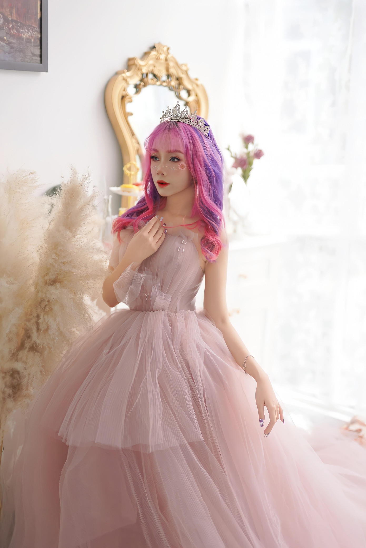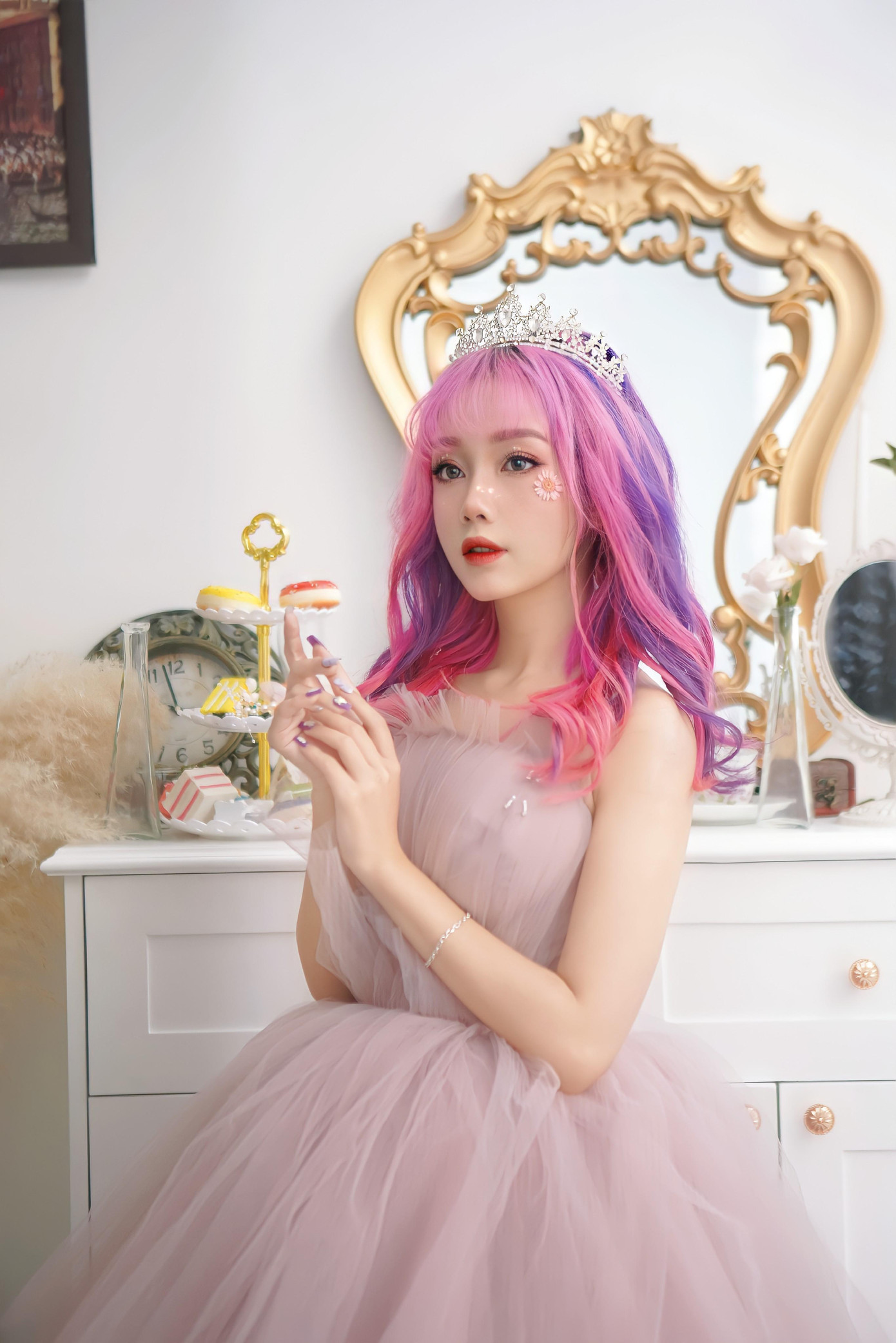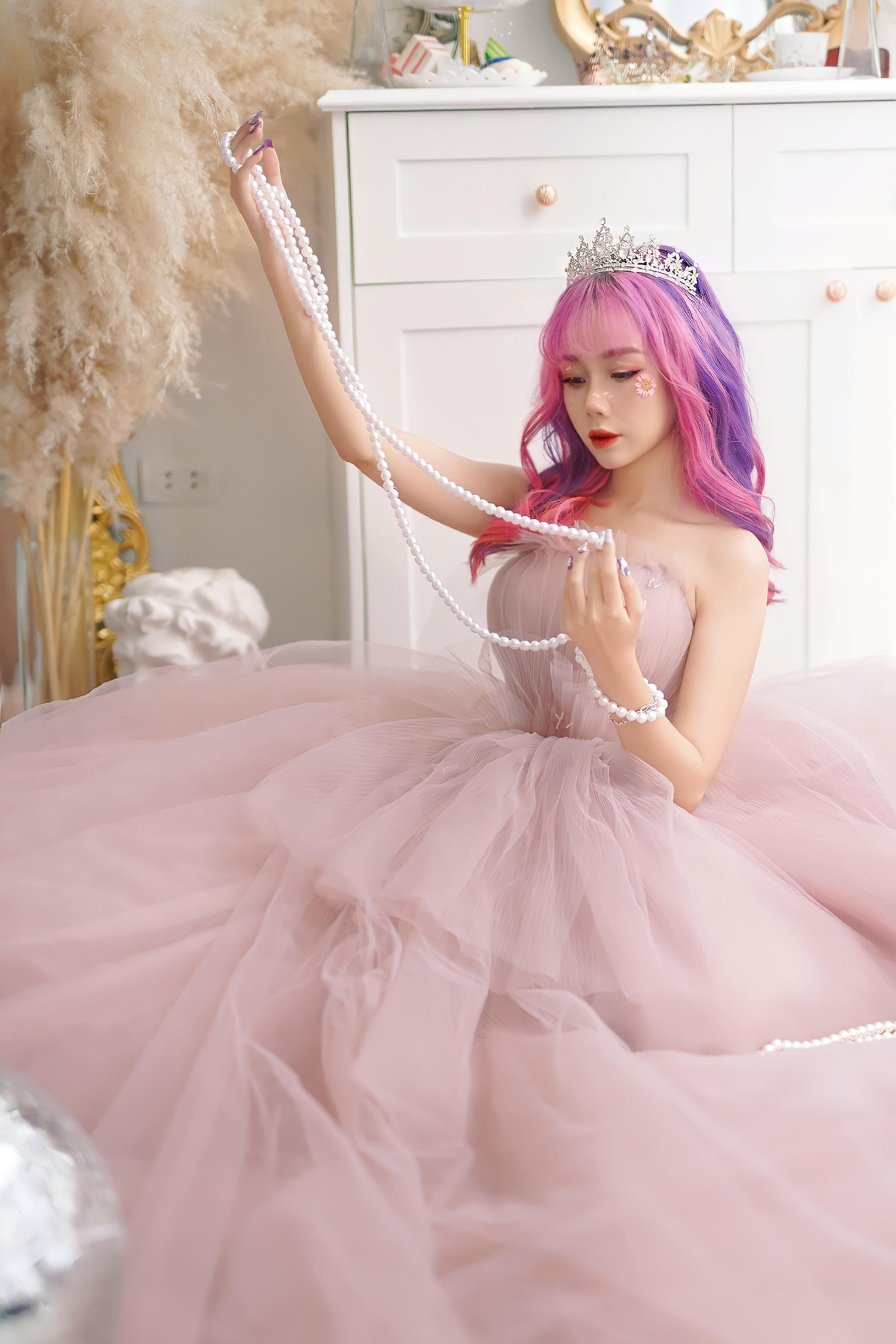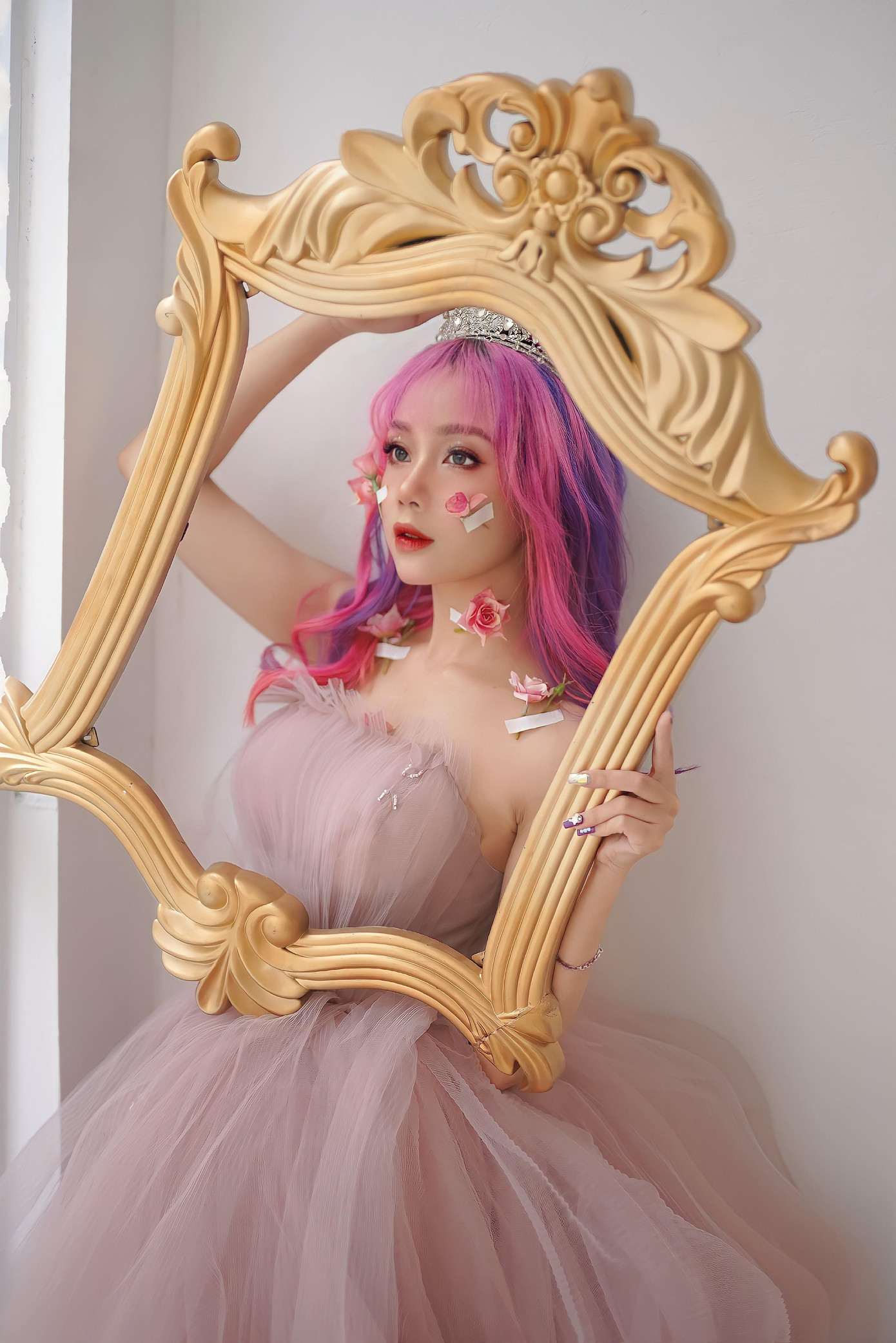 Bộ ảnh được lên ý tưởng rất kĩ, từ makeup đến trang phục và bối cảnh sao cho phù hợp với tóc màu hồng của mình. Mình và anh Su đã mất khá nhiều công sức để lên kế hoạch và chuẩn bị nhiều phụ kiện cầu kì cho concept này. Điểm nhấn của bộ ảnh là chiếc váy công chúa bồng bềnh và chiếc bánh kem, mình kết hợp vương miện trắng làm dịu sắc hồng đi một chút.