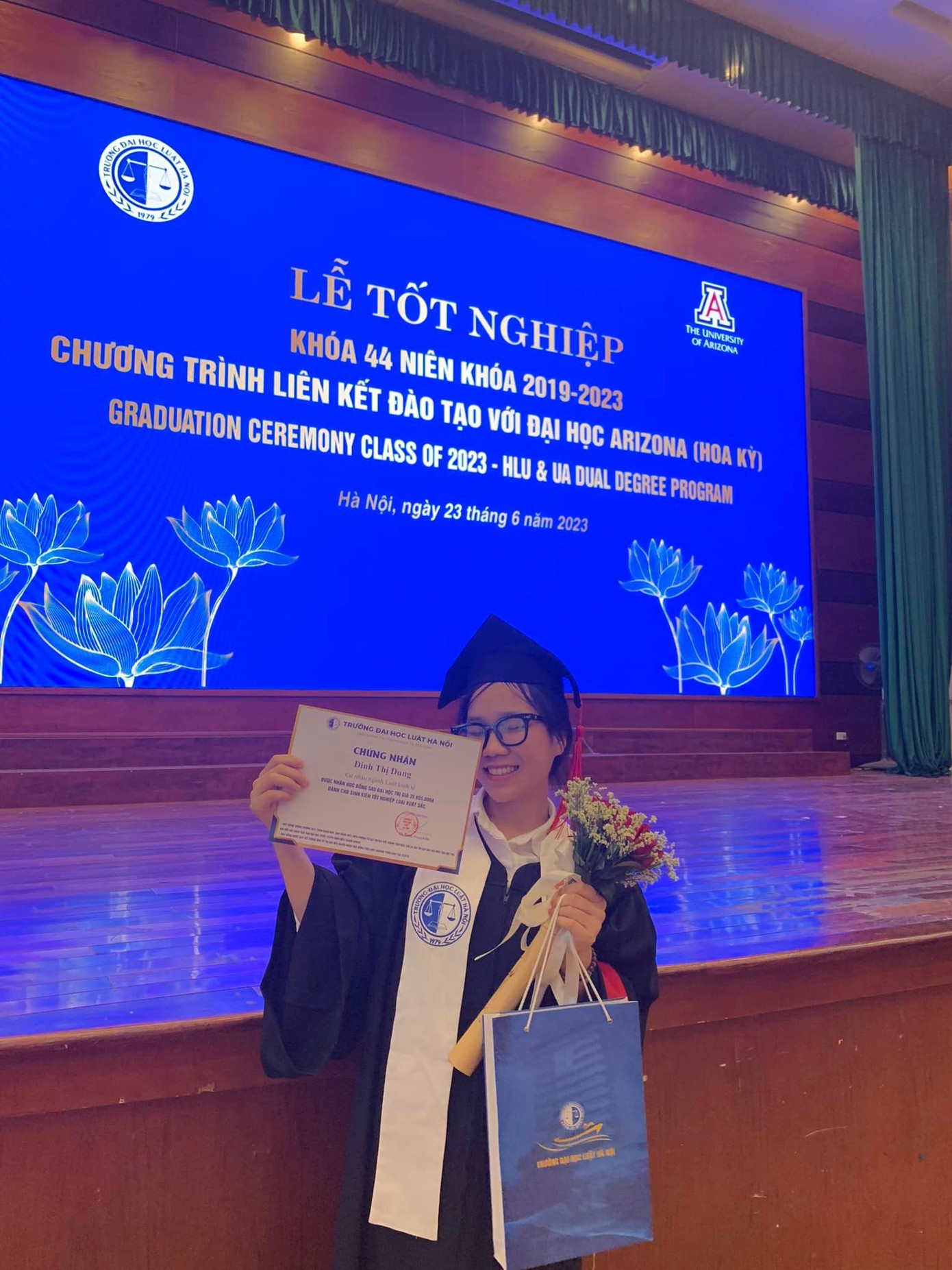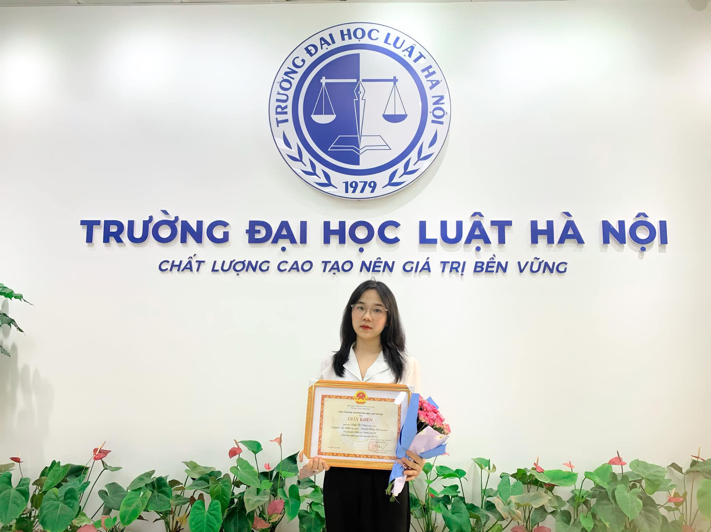 | Dung là một trong số các sinh viên có kết quả tốt nghiệp loại Xuất sắc và được trường Đại học Luật Hà Nội khen thưởng. |