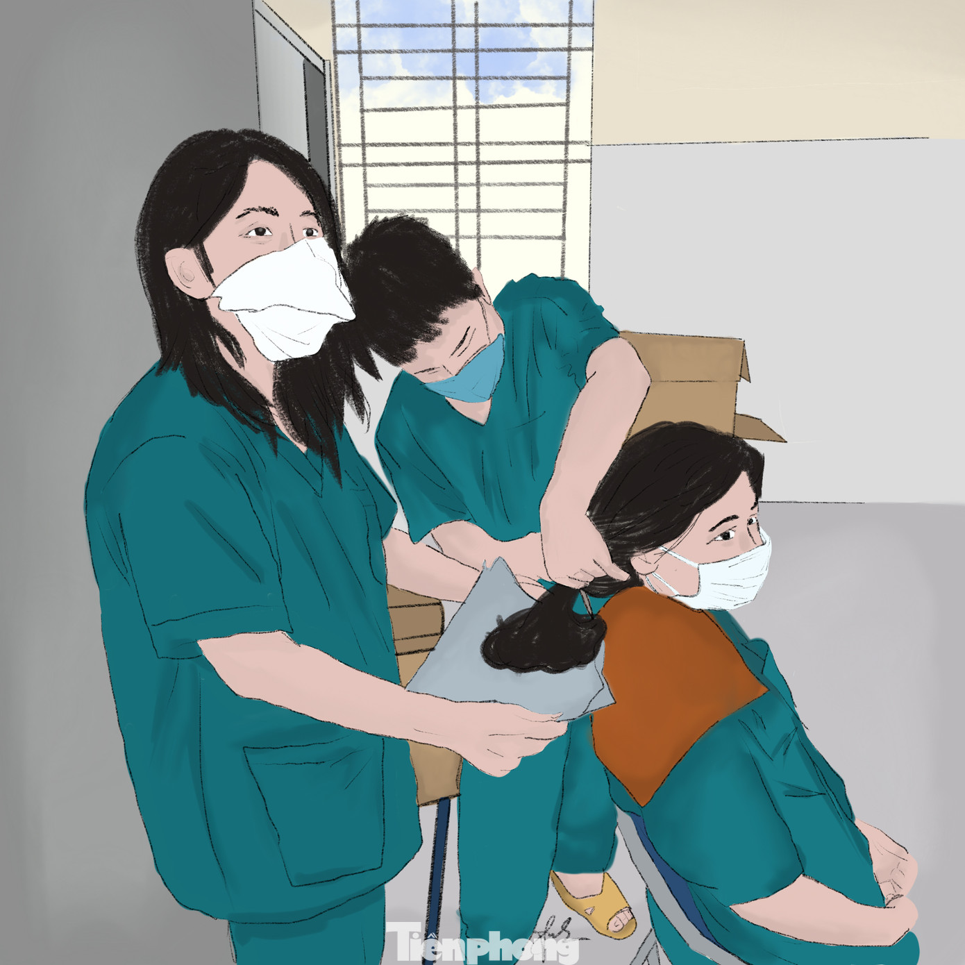 Các bác sĩ trong bộ đồ bảo hộ kín mít ngả lưng trên tấm bìa cứng, trên ghế đá... sau cả ngày làm việc mệt nhọc được Minh Anh khắc họa sinh động