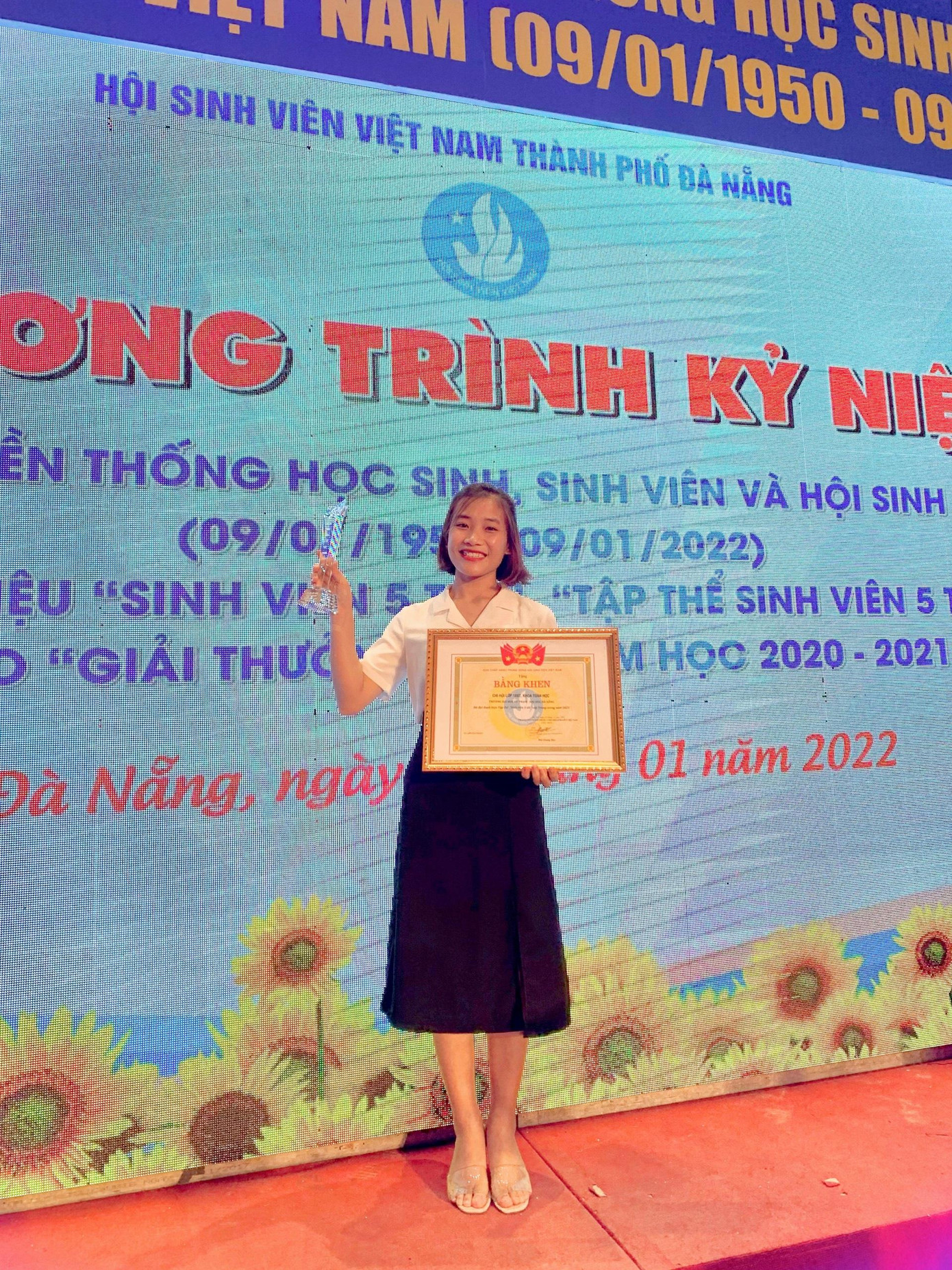 | Bên cạnh đó, cô cũng vinh dự đại diện nhận Danh hiệu: Tập thể sinh viên 5 tốt" cấp Trung ương năm học 2020 - 2021. |
