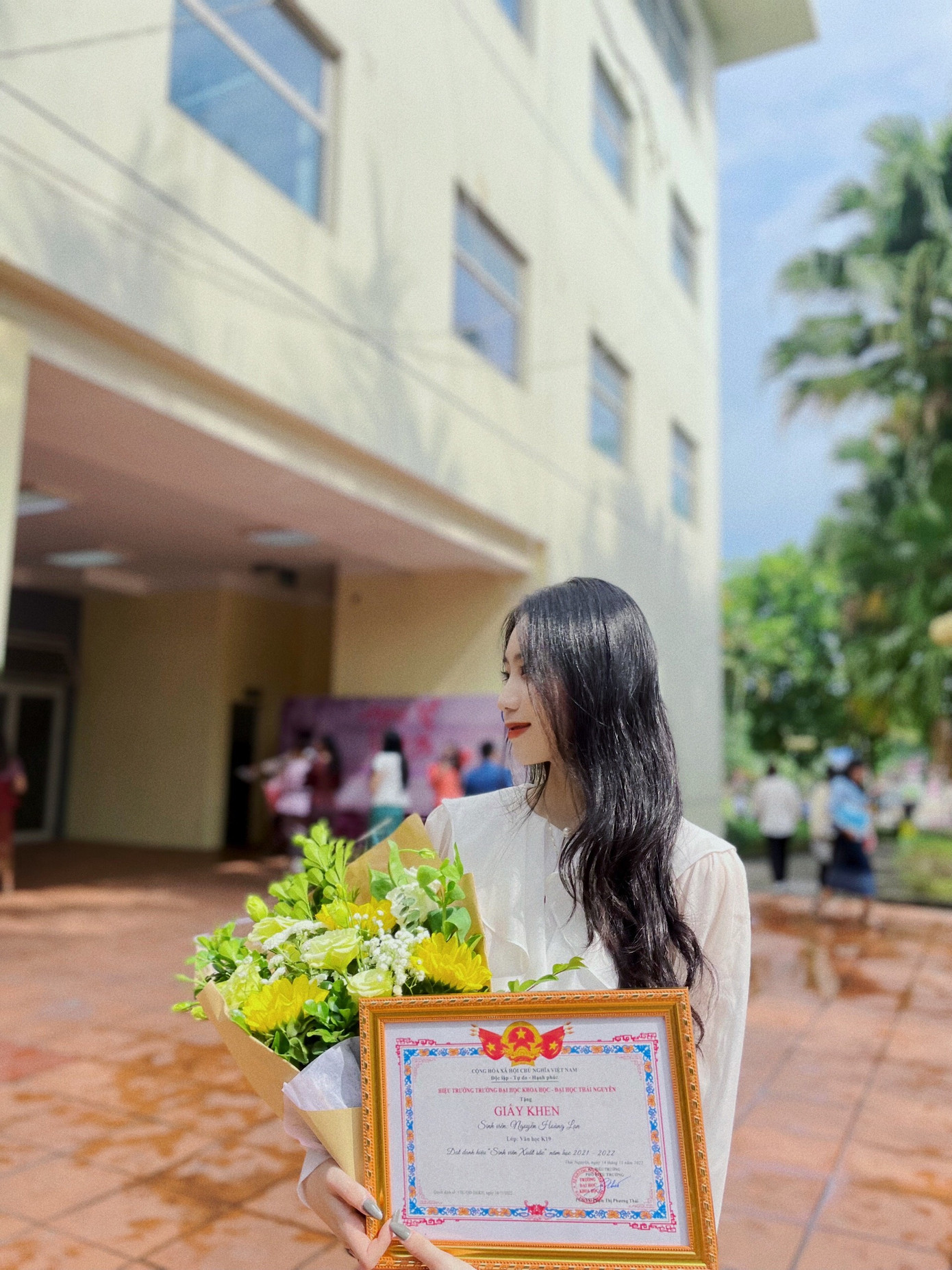 Mình còn đạt giấy chứng nhận “Sinh viên 5 tốt” cấp Trường năm 2021-2022, đạt danh hiệu “Thanh niên tiên tiến làm theo lời Bác” năm 2022-2023. Đặc biệt, vào cuối tháng 5 vừa rồi, mình rất may mắn và vinh dự khi trở thành 1 trong những đại biểu của tỉnh Thái Nguyên đến với vùng hải đảo thiêng liêng của Tổ quốc và nhận huy hiệu chiến sỹ Trường Sa năm 2023.