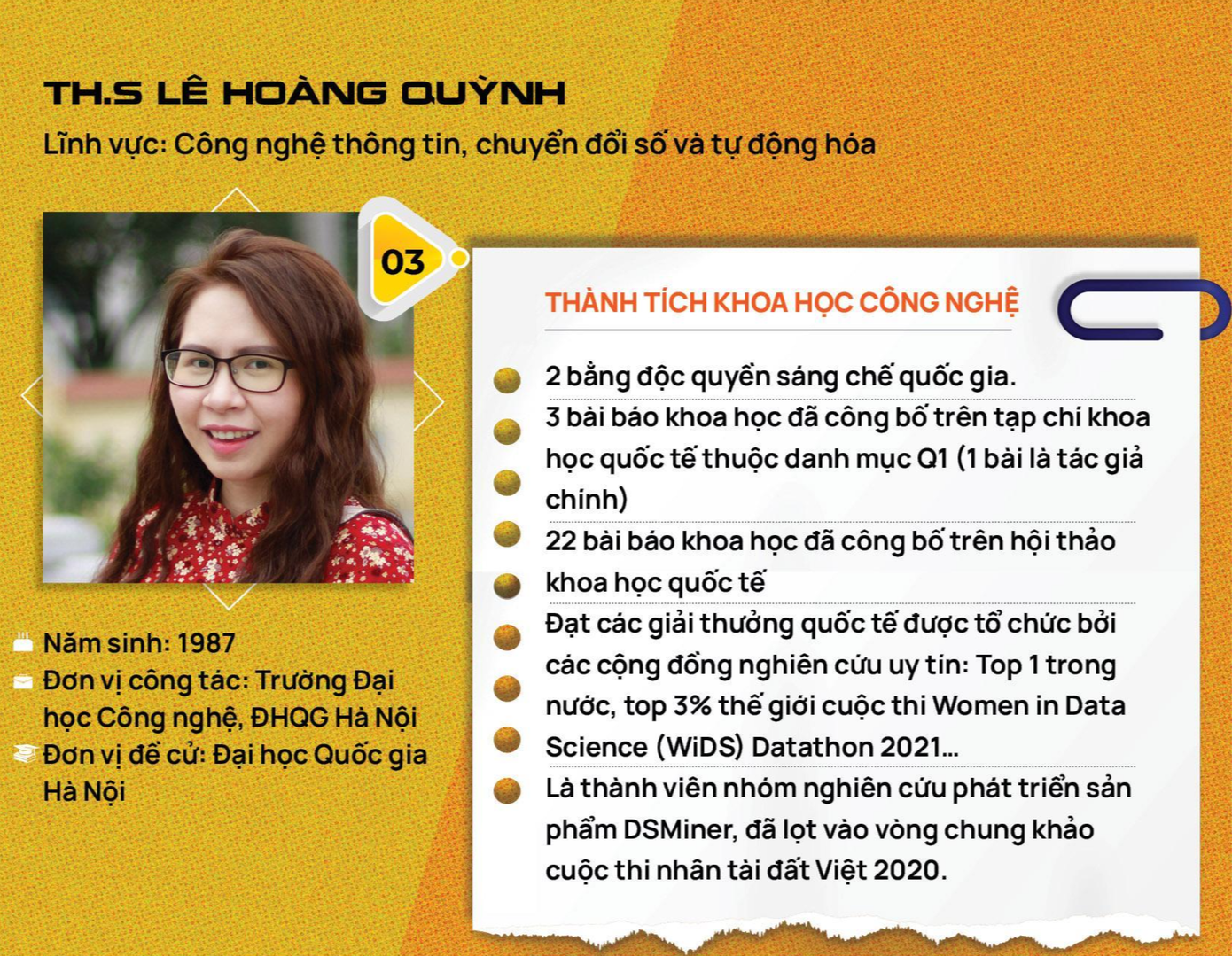 | Chị Lê Hoàng Quỳnh từng là sinh viên trường Đại học Công nghệ, ĐH Quốc gia Hà Nội. Cơ duyên đưa chị đến với lĩnh vực Công nghệ thông tin rất tự nhiên từ suy nghĩ “chữ mình xấu, thôi vào ĐH Công nghệ cho có nhiều đồng đội gõ máy tính đỡ phải viết”. |