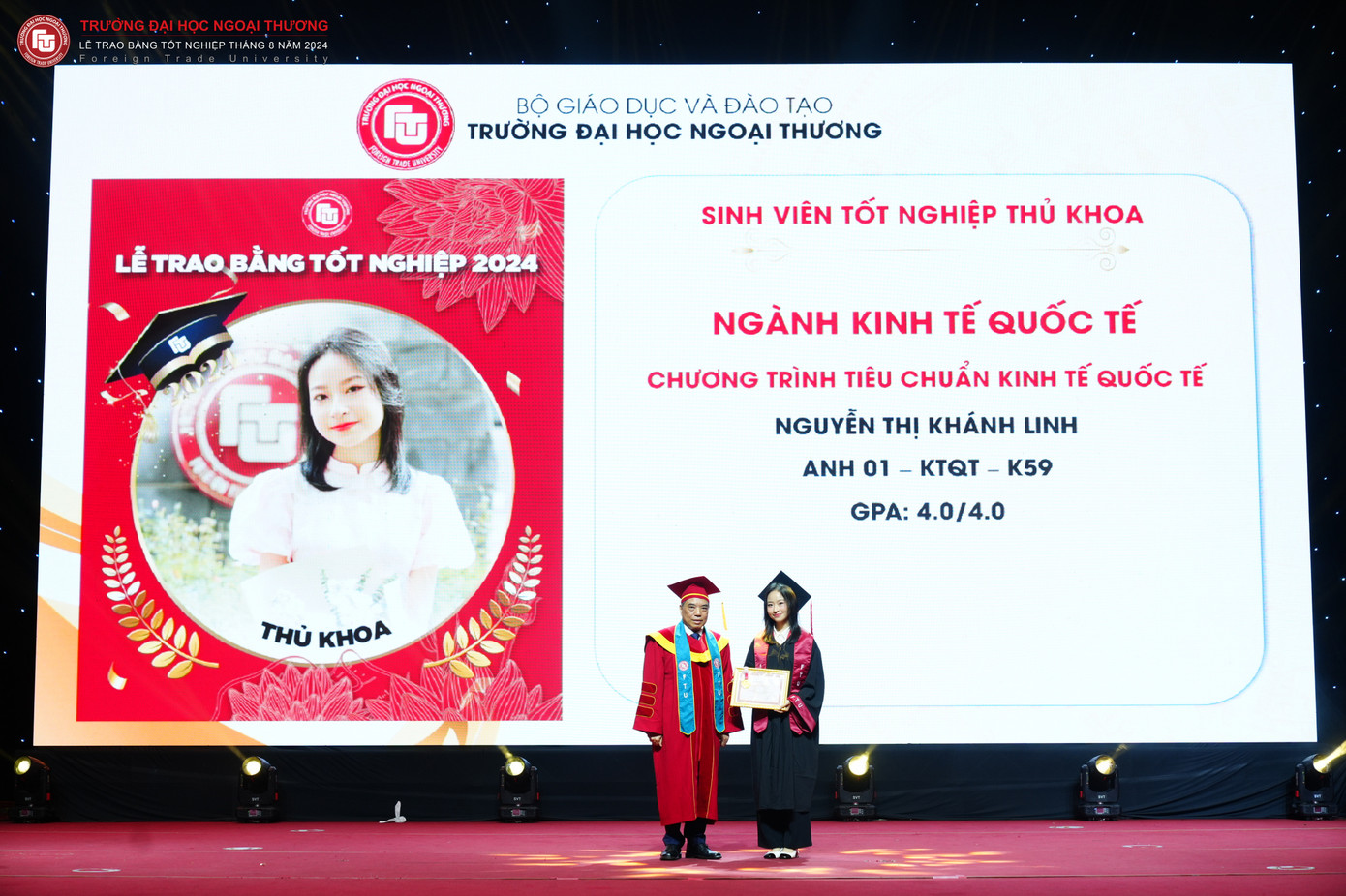 Sau 4 năm học tập dưới ngôi trường Ngoại thương, Khánh Linh đã xuất sắc trở thành Thủ khoa đầu ra, là tấm gương cho các thế hệ sinh viên sau này của trường. Cô nàng tâm sự: “Thú thật, khi nhận được tin mình đạt được danh hiệu Thủ khoa đầu ra của ngành Kinh tế quốc tế, Trường Đại học Ngoại thương, mình khá bất ngờ. Trong suốt quá trình học tập, mình chú ý đến hành trình trải qua và kiến thức học được hơn là đặt nặng vấn đề thành tích. Với mình, danh hiệu thủ khoa cũng là món quà mình đem đến cho cả gia đình và những người mình yêu thương”.