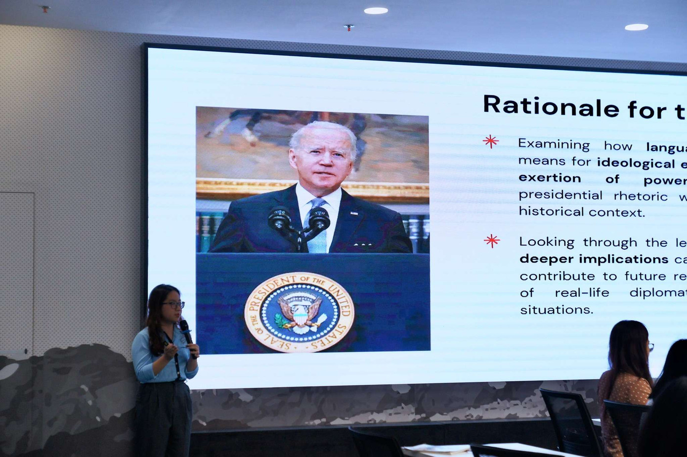 Nhớ lại khoảng thời gian thực hiện khóa luận, Nguyệt Minh chia sẻ: “Đối với mình, quá trình làm khóa luận có khá nhiều gian truân. Một phần vì mình chưa có nhiều kinh nghiệm trong mảng nghiên cứu khoa học, một phần vì đề tài mình chọn cũng thuộc dạng ‘khó nhằn’, đòi hỏi phải kết hợp, vận dụng nhuần nhuyễn kiến thức chuyên ngành ngôn ngữ, kiến thức chính trị và đưa được quan điểm, màu sắc cá nhân vào bài. May mắn thay, nhờ sự đồng hành và chỉ bảo tận tình của giảng viên hướng dẫn – PGS.TS. Kiều Thị Thu Hương, mình đã hoàn thành khóa luận một cách suôn sẻ và ‘về đích’ thành công với số điểm 9.5. Ngày mình bảo vệ khóa luận, rất nhiều người thân, bạn bè đã đến chúc mừng mình. Mình rất bất ngờ, cảm động và biết ơn những tình cảm chân thành và sự ủng hộ từ mọi người, đó sẽ là kỷ niệm mà mình không bao giờ quên!”