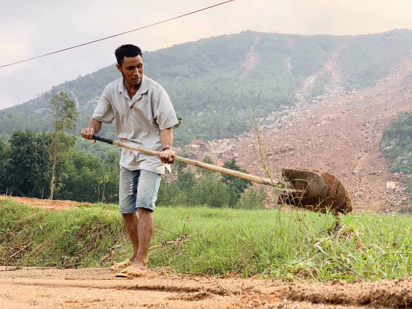 “Lúc đó vợ ôm cháu chạy ra con đường khác phía sau để trốn vì lo sợ núi sạt vào nhà. Giờ nghĩ lại vẫn còn ám ảnh, nếu mưa tiếp tục thì không biết sẽ như thế nào”, ông Thủy nói. Trong ảnh ông Thủy đang đào đất để làm đường sau khi đất đá sạt lở lấp mất đường vào nhà.