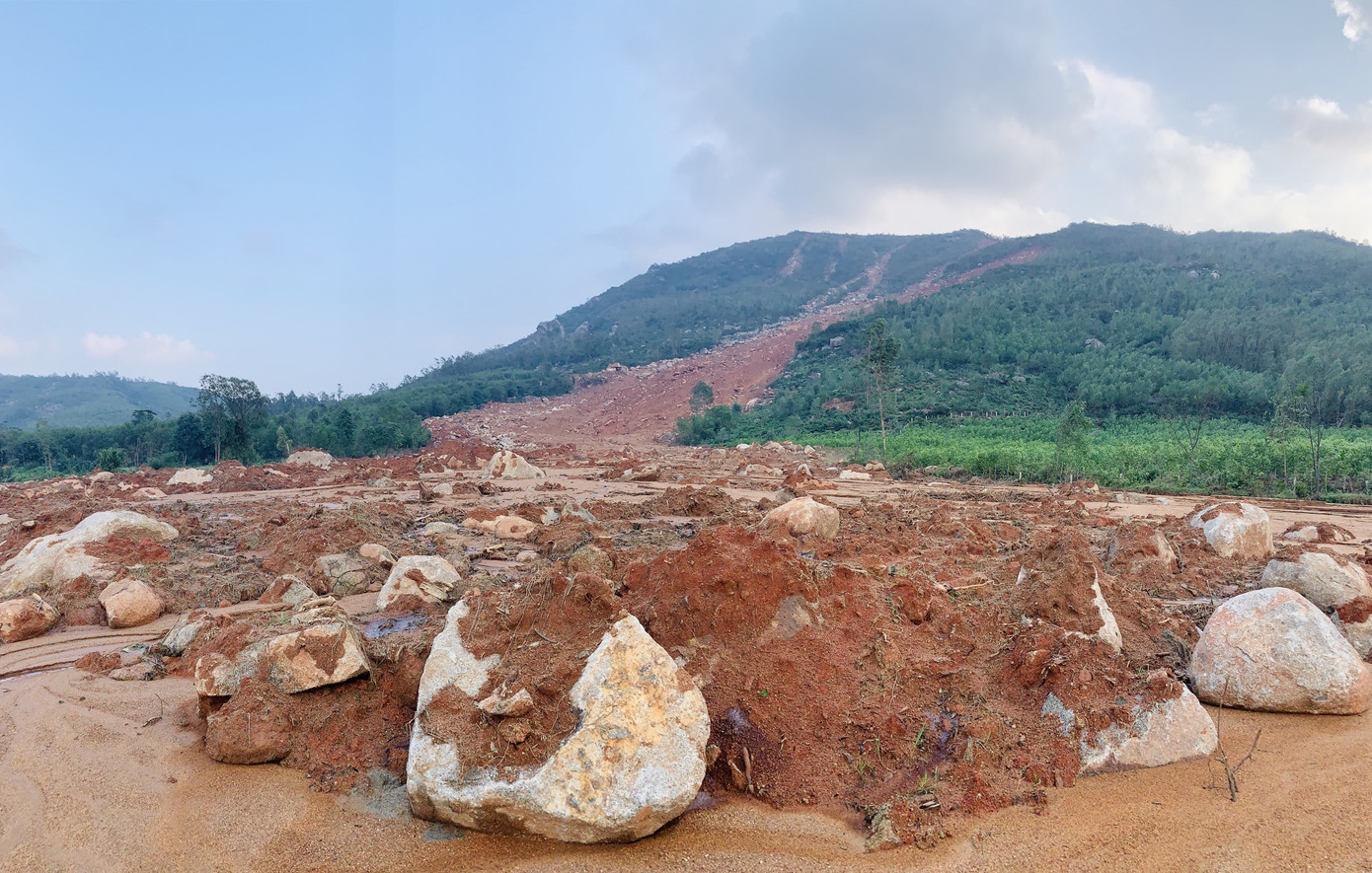 Ghi nhận tại điểm sạt lở ở khu vực chân núi Chai (thôn 6) và núi Bục (thôn 3), có hàng ngàn khối đất đá khổng lồ tràn xuống dưới chân núi, lấp đường đi nhà dân. Nhiều ha đất sản xuất hai vụ của dân bị đất đá từ núi đổ xuống vùi lấp nghiêm trọng.