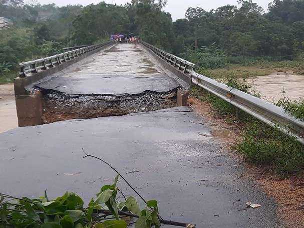 Ông Trình Văn Nhã - Chủ tịch UBND huyện Thanh Chương cho biết, hiện các đoàn công tác của huyện đang có mặt ở những điểm xung yếu. Ưu tiên hàng đầu là đảm bảo an toàn tuyệt đối cho người ở các khu vực ngập sâu. Mưa lũ đã khiến 2 người bị thương. Ảnh: Cây cầu tại xã Thanh Sơn, huyện Thanh Chương bị nước xói đầu mố. Lực lượng chức năng phải cắt cử người trông coi và cấm phương tiện qua lại.