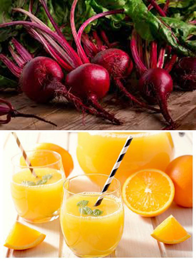Củ cải đường và nước ép cam: Đối với những phụ nữ bị mệt mỏi trong chu kỳ kinh nguyệt thì củ cải đường và cam tạo nên một loại nước ép hoàn hảo cho họ. Nó cũng ngăn ngừa các dấu hiệu tâm lý khác nhau của rối loạn kinh nguyệt như các lo âu, căng thẳng, trầm cảm và khó chịu.