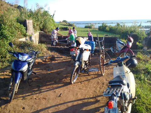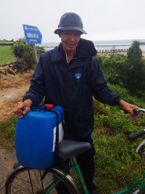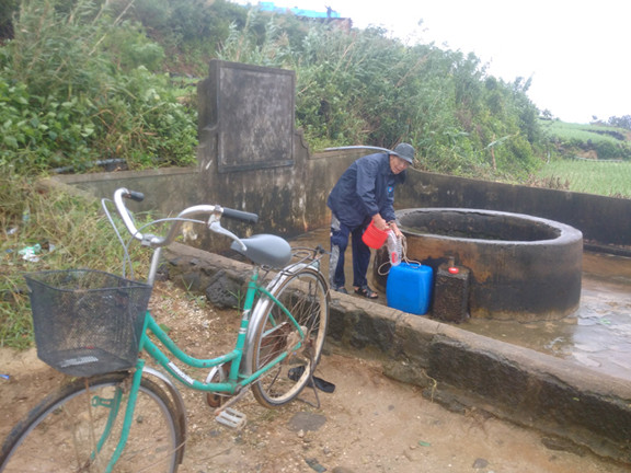 Sáng 10/1, trên đảo Lý Sơn vẫn mưa lạnh kéo dài, sóng tung trắng xóa. Mưa lạnh, nhưng ông Nguyễn Thành Long (74 tuổi, trú khu 2 xã An Vĩnh, Lý Sơn) vẫn đạp xe ra giếng Xó La lấy nước. Nhà ông cách giếng gần 1 cây số.