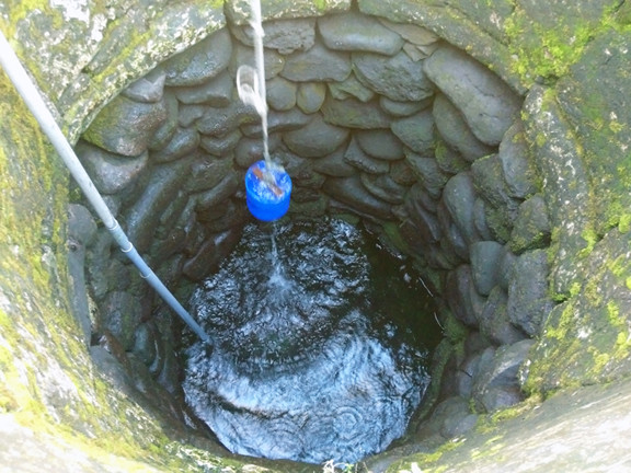 Giếng sâu gần 7 mét, lòng giếng phía dưới được người xưa kè bằng đá đen phún thạch của núi lửa.