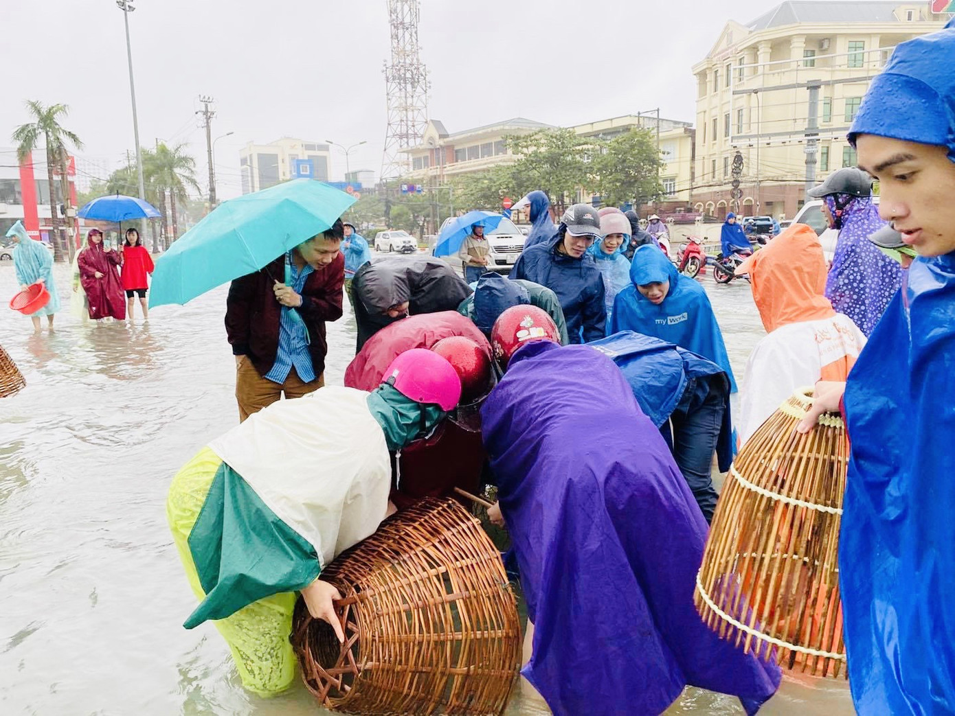 Ngày 19/10, khi nước lũ dâng cao, toàn TP Hà Tĩnh chìm trong biển nước thì tại vòng xuyến BMC đoạn ngã tư giao nhau giữa trục đường Hà Huy Tập và Hàm Nghi có hàng chục người dân ra đây để bắt cá.