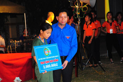 Phó bí thư Tỉnh đoàn Nghệ An Dương Hoàng Vũ tặng quà động viên em Lê Thiên Trang. Trang mồ côi bố, mẹ bỏ đi khi em còn nhỏ.