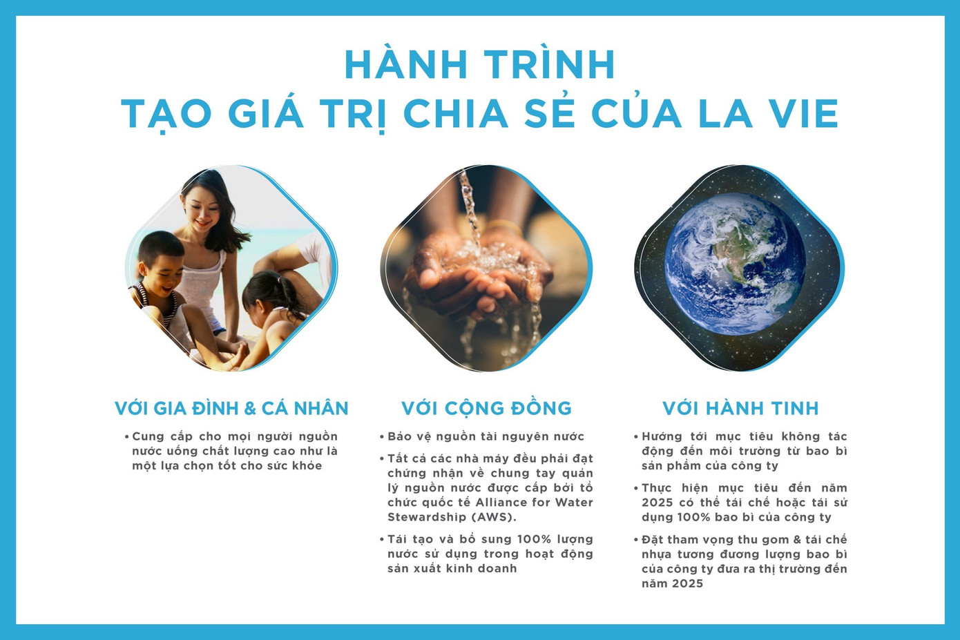 Với quan niệm không một ai có thể một mình bảo vệ được các nguồn nước chung, các sáng kiến tiết kiệm nước luôn được La Vie chia sẻ đến các nhà cung cấp dịch vụ và đối tác để cùng nhau sử dụng nước hiệu quả.