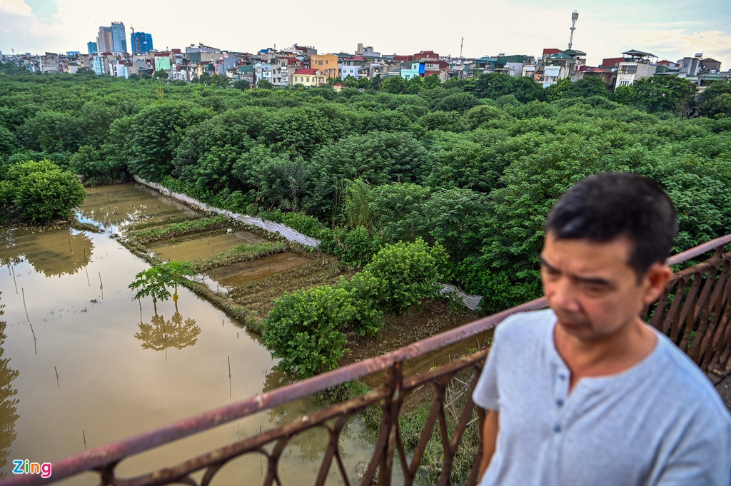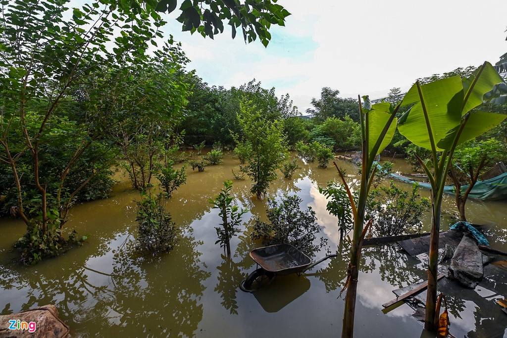 Vườn cây ăn quả, ao cá của gia đình ông Bình (gần cầu Chương Dương) ngập sâu trong nước. "Từ đêm qua cả nhà không được ngủ vì lo hái quả sớm. Còn ao cá thì mất trắng không thu được gì. Uớc tính sơ bộ gia đình tôi thiệt hại khoảng 30 triệu đồng", ông Bình nói.