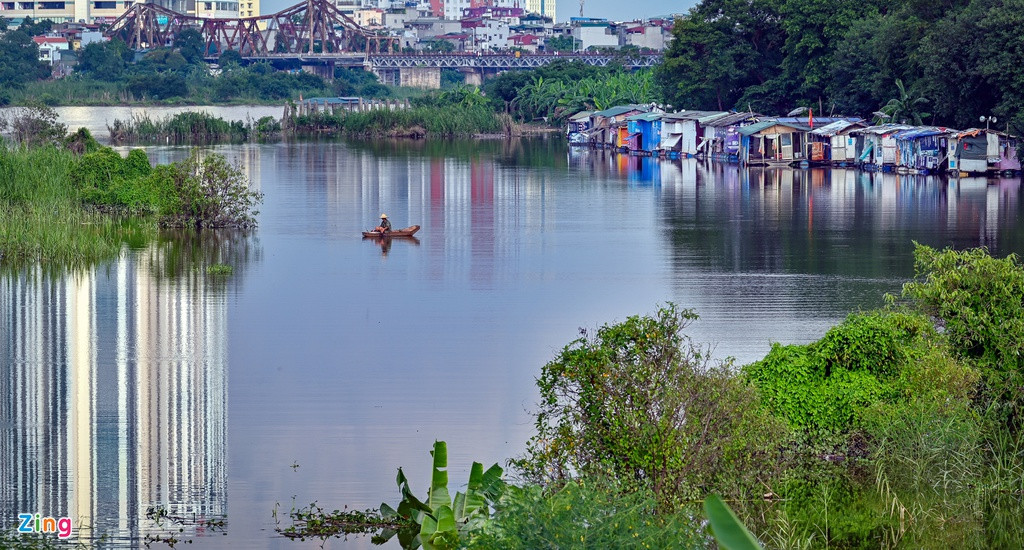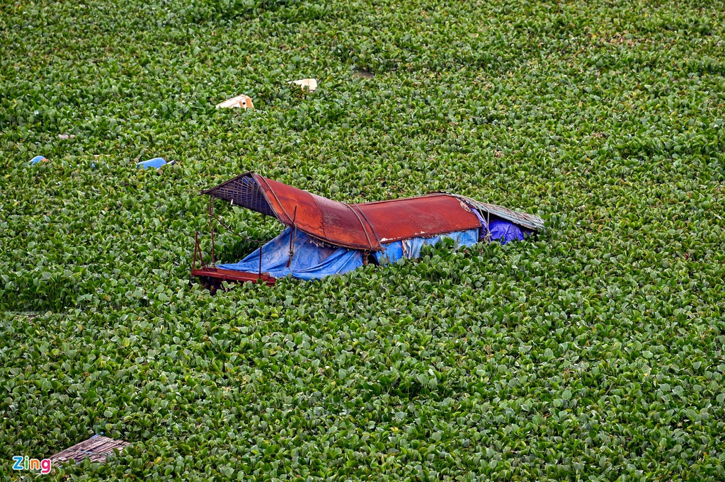 Nước dâng cao khiến bèo, rác vây kín xóm chài nhỏ dưới chân cầu Long Biên.