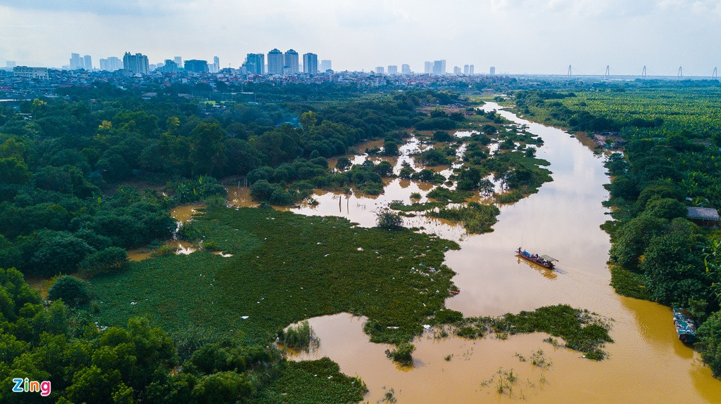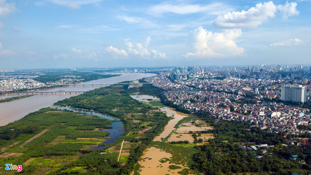 Khu vực bãi sông Hồng nhìn từ trên cao được chụp chiều 21/8. Theo Trung tâm dự báo Khí tượng Thủy văn Quốc gia, mưa dông xuất hiện trở lại ở Bắc Bộ từ đêm 20/8 và dự báo kéo dài đến hết ngày 22/8.Tại Hà Nội và đồng bằng Bắc Bộ, mưa rào và dông xảy ra kèm theo nhiệt độ giảm mạnh.