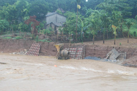 Mưa lũ lớn đã làm ngập hoàn toàn tuyến đường phục vụ thi công móng cầu Giang Đông bắc qua sông Hồng nối trung tâm xã Vạn Hòa với khu đô thị mới Lào Cai – Cam Đường.