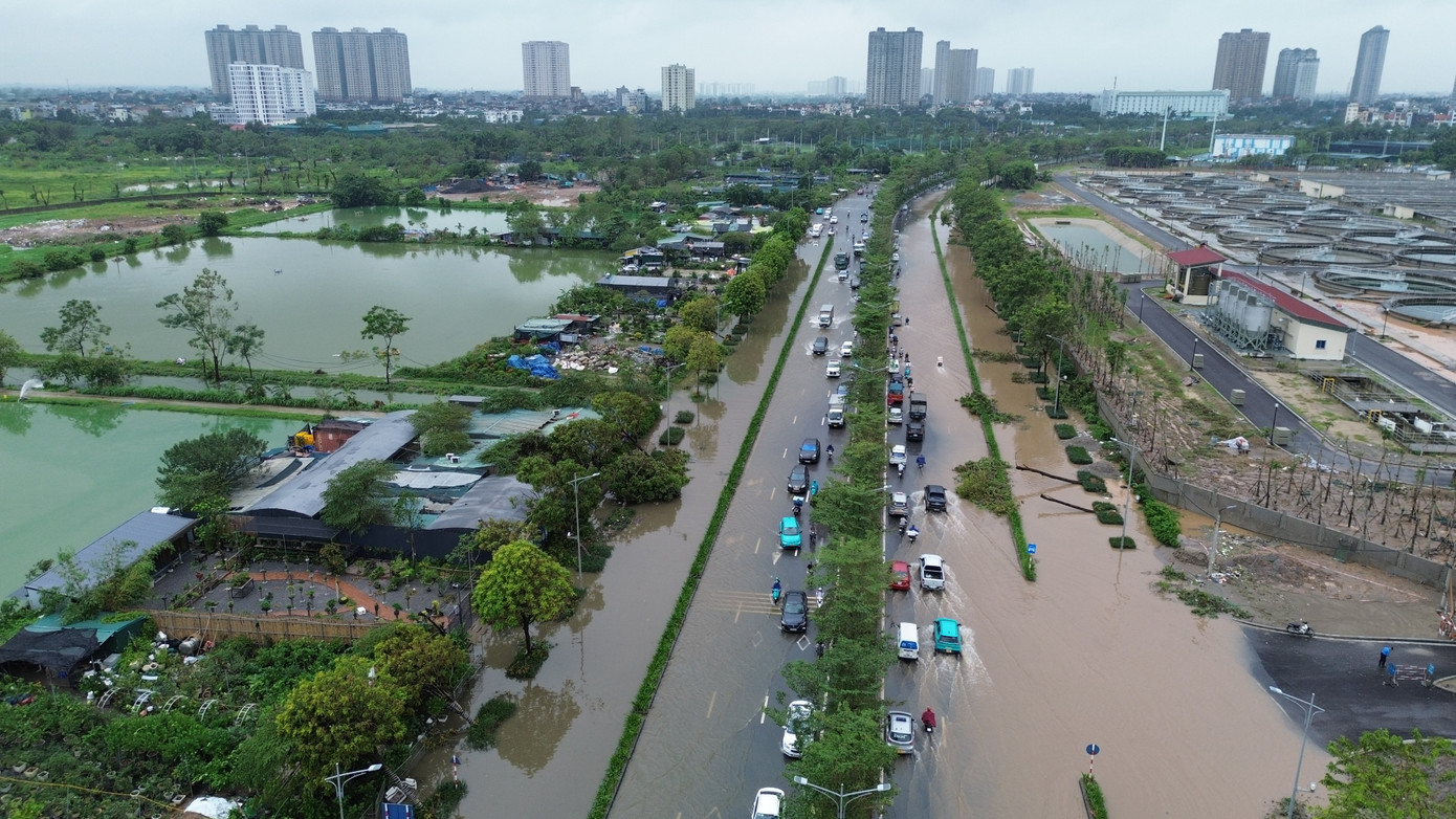 | Hầu hết đoạn đường Phạm Tu (từ vành đai 3 kéo dài đến đường 70) bị ngập sâu trong nước. |
