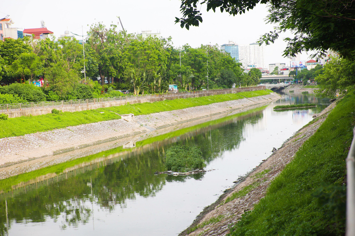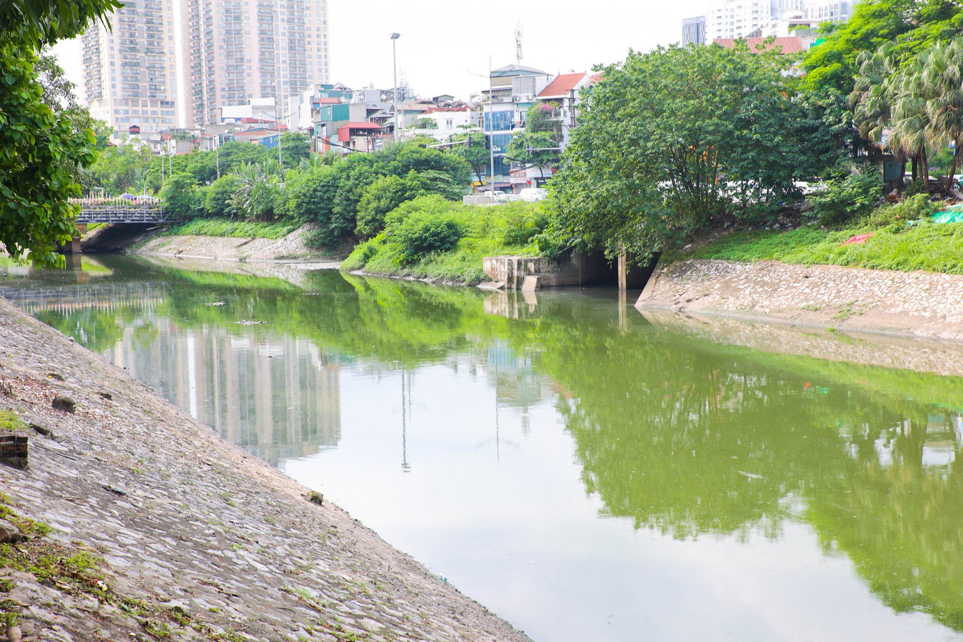 Trưa 30/6, dù không có mưa lớn, nhưng nước sông Tô Lịch vẫn khá nhiều. Không giống như hình ảnh dòng sông đen kịt như trước, nước sông Tô Lịch chuyển sang màu xanh lục. Ảnh: Nguyễn Trọng Tài.