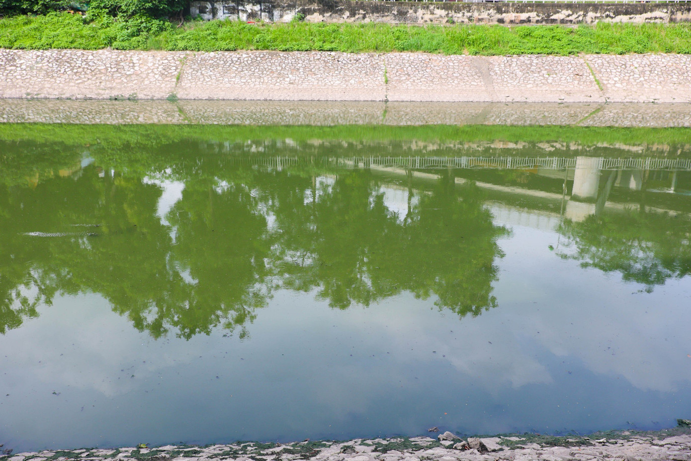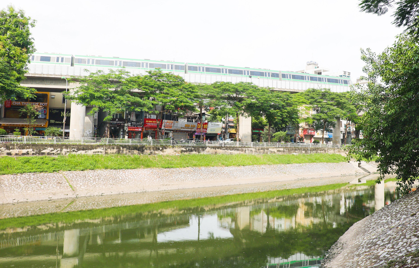 Đã lâu rồi, sông Tô Lịch mới có màu nước xanh như thế này. Ảnh: Nguyễn Trọng Tài.