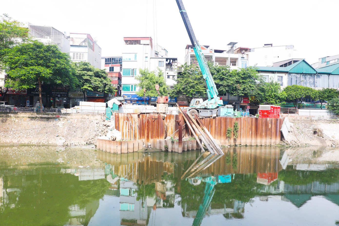 Hai bên sông Tô Lịch hiện vẫn đang triển khai thực hiện các công trình thu gom nước thải trong Dự án Nhà máy xử lý nước thải Yên Xá - nhằm thu gom toàn bộ nước thải khu vực dân cư dọc sông để đưa về xử lý tại nhà máy, giảm bớt ô nhiễm cho sông Tô Lịch. Ảnh: Nguyễn Trọng Tài.