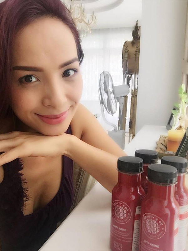 Á hậu Dương Tú Anh bên cạnh sản phẩm mà cô dùng làm bí quyết làm đẹp