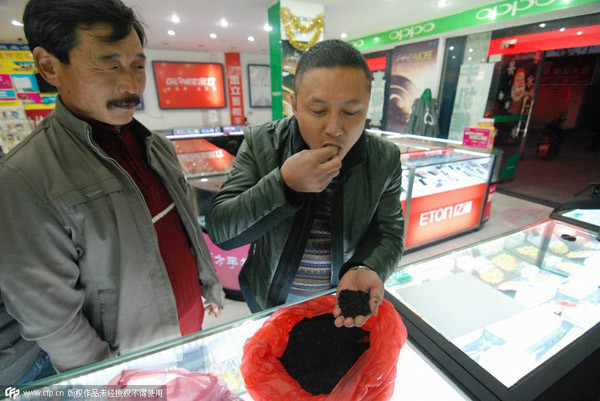 Một khách hàng của ông Chen nếm thử món kiến đen sấy trước khi mua chúng tại một cửa hàng. Thông thường giá bán 1 kg kiến đen là 1.600 nhân dân tệ (khoảng 350 USD).