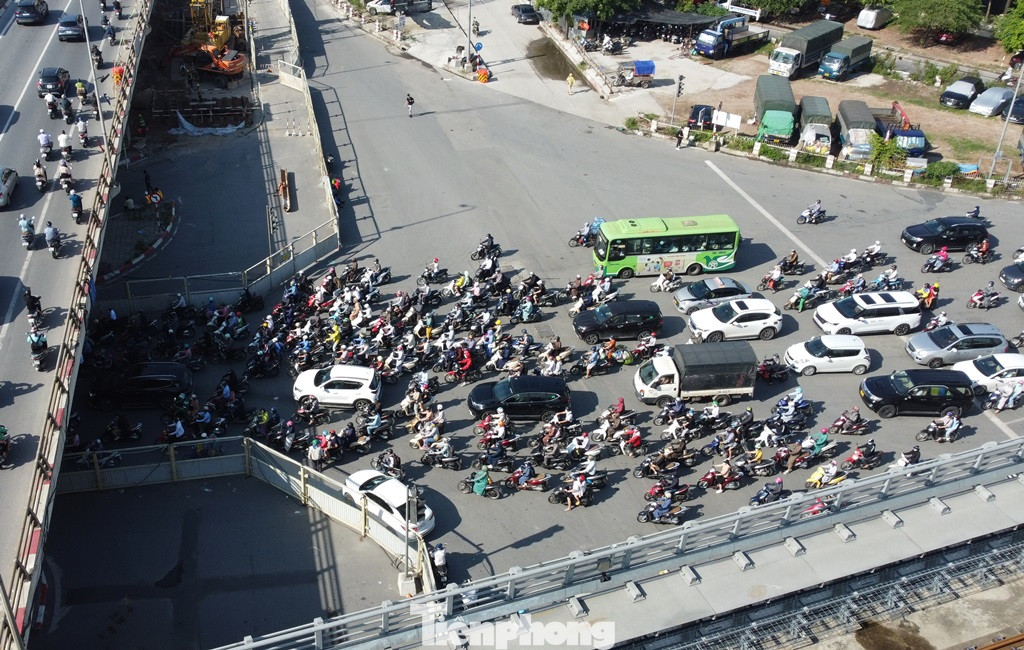 | Ở giữa nút, hàng rào thi công hai nhánh cầu vượt thép nằm song song với cầu vượt Mai Dịch đã mở rộng thêm chiếm đến hơn nửa lòng đường. Xe qua nút Mai Dịch hướng Phạm Hùng - Phạm Văn Đồng và ngược lại chỉ còn một, hai làn xe. |