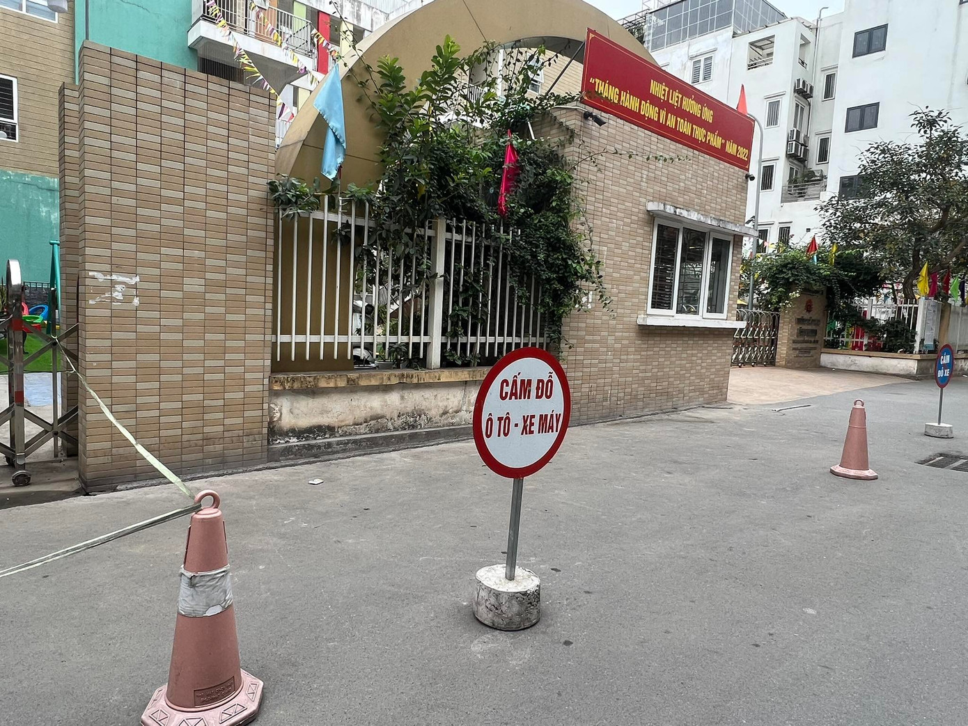 Tại cổng trường Tiểu học Nguyễn Tuân và Trường mầm non Bình Minh, nhà trường phải cắm nhiều biển “cấm đỗ” di động để giữ được khoảng sân trước cổng. Đặc biệt, Trường mầm non Bình Minh còn giăng dây để ngăn ô tô đỗ cổng trường.