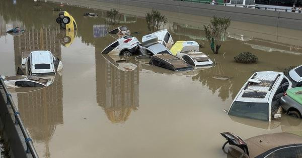 Một video khác cho thấy nhiều người dân lội trên phố ngập nước ngang hông đang cố gắng dùng dây thừng kéo những người mắc kẹt trong trung tâm thương mại dưới lòng đất lên. Một clip được Nhân dân Nhật báo đăng tải cho thấy những người đi xe máy trên phố bám vào nhau để tránh bị lòng nước lũ cuốn trôi đi.