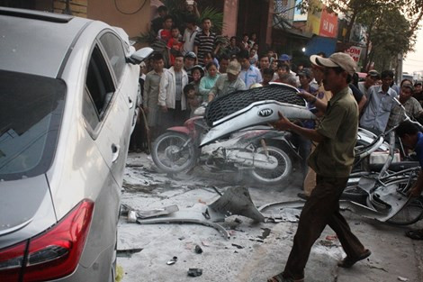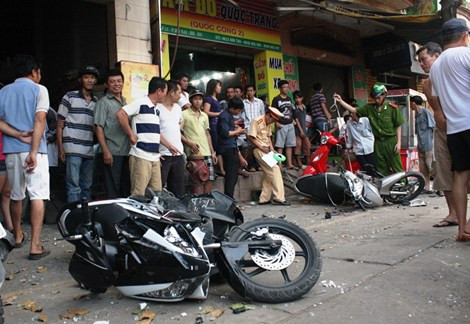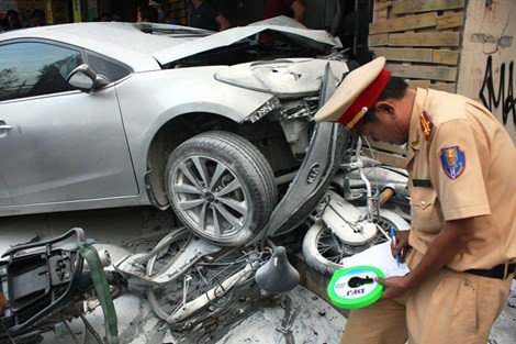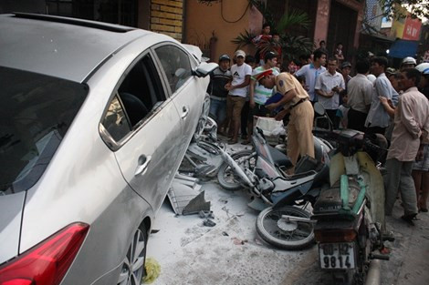 Chiếc ô tô “điên” lao vào hai xe máy đang lưu thông trên đường. Không dừng lại đó, chiếc ô tô tiếp tục lao lên vỉa hè tông vào xe bán bánh mì cùng hai chiếc xe máy đang dựng bên đường. Ô tô chỉ dừng lại khi tiếp tục cuốn ba chiếc xe máy vào gầm và tông vào cửa của tiệm bán quần áo.