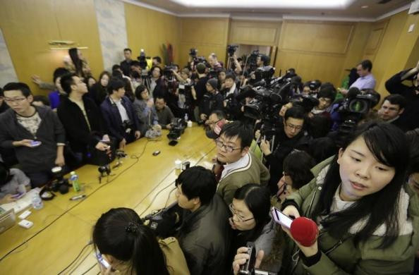 Các phóng viên tại phòng họp báo ở một khách sạn ở Bắc Kinh, Trung Quốc